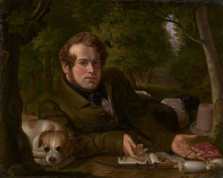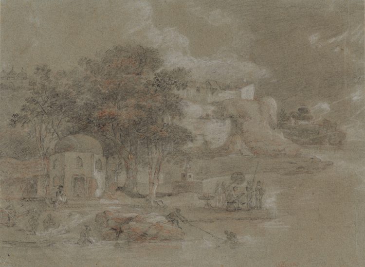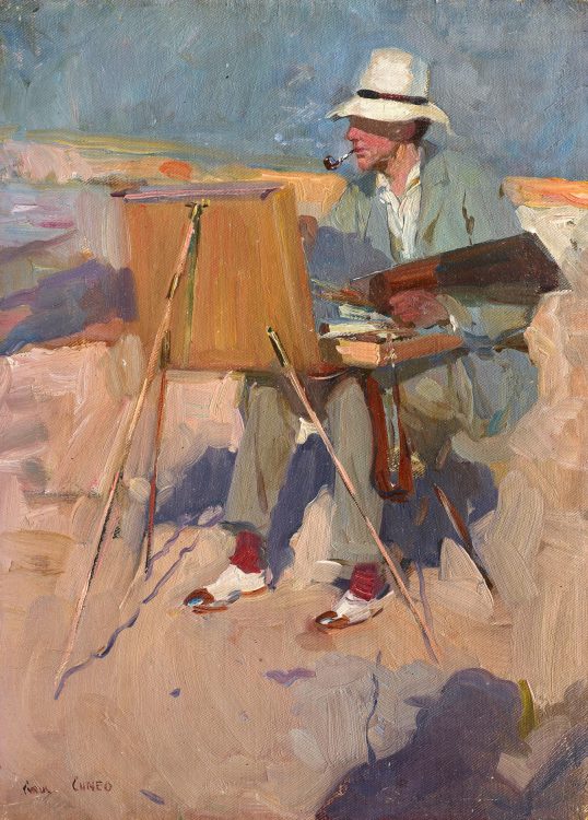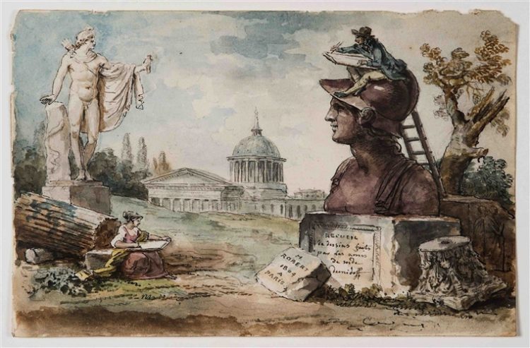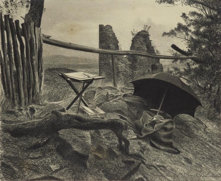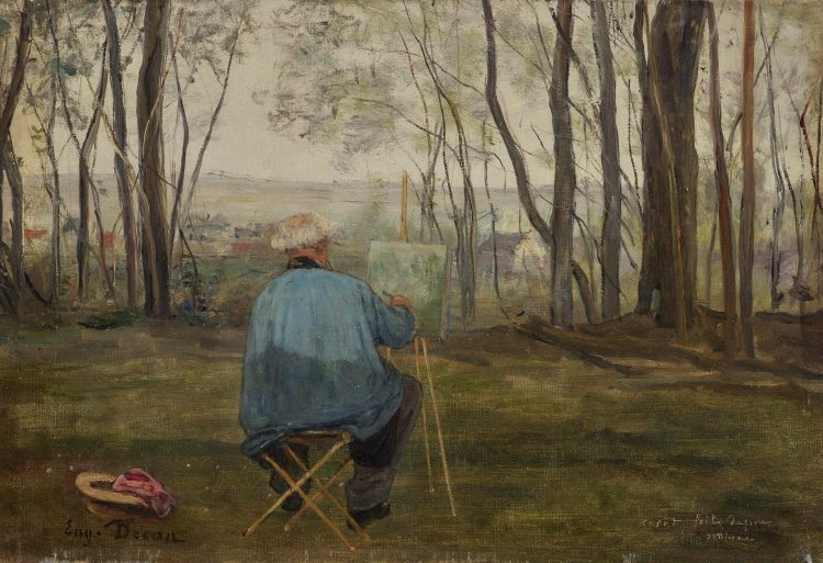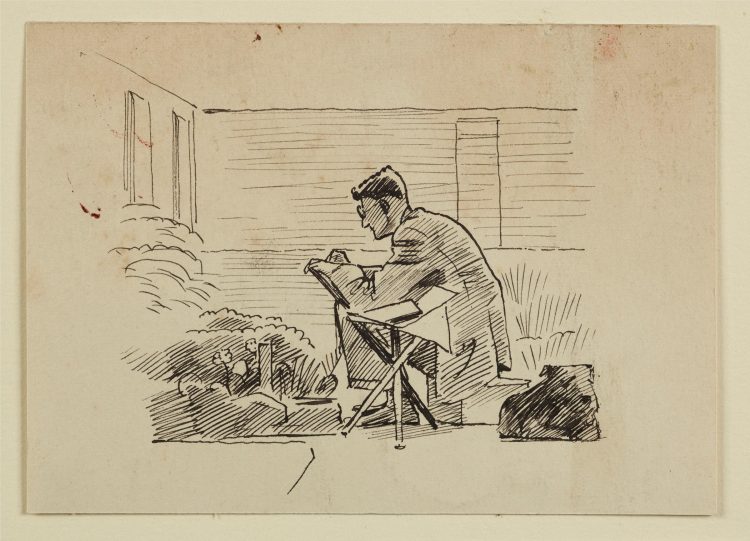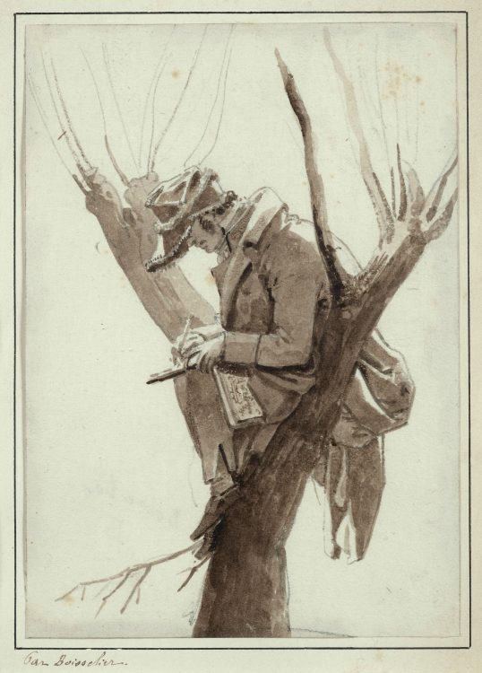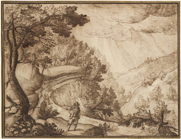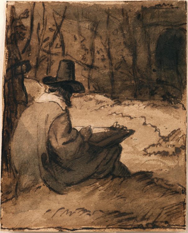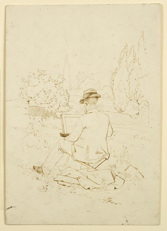The practice of working out of doors to create landscape sketches and studies to be later worked up in the studio is a long established one. An early example from the Katrin Bellinger collection is Lambert Doomer’s draughtsman sketching by a tree of circa 1660, where he captures a colleague working out of doors. An Italian drawing, Remigio Cantagallina’s artist walking and sketching in a landscape, is another early example.