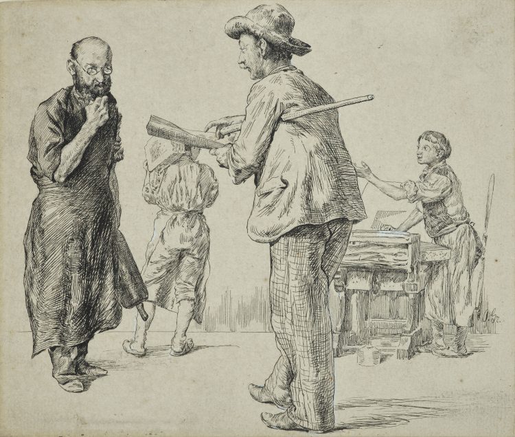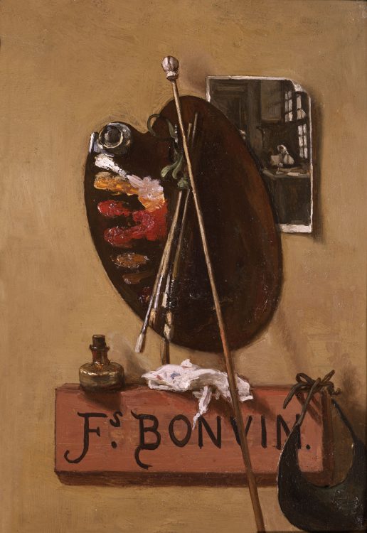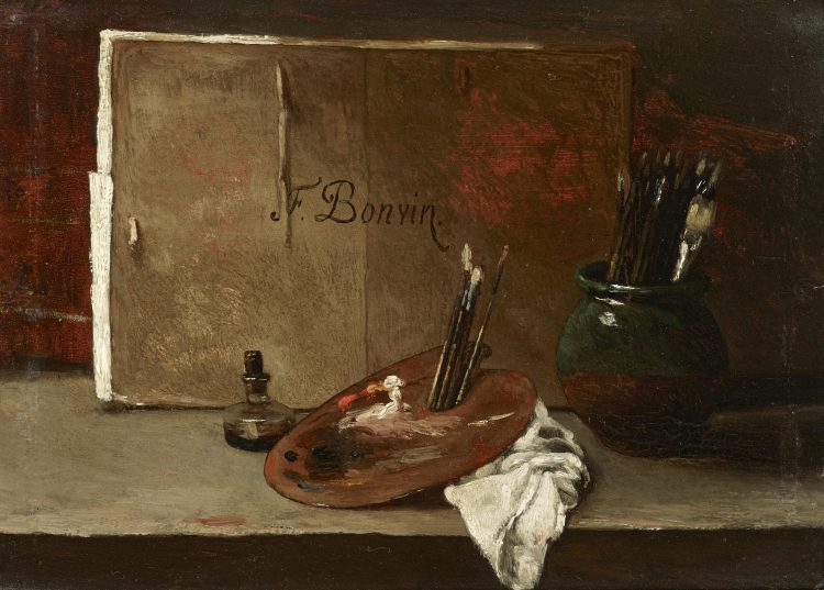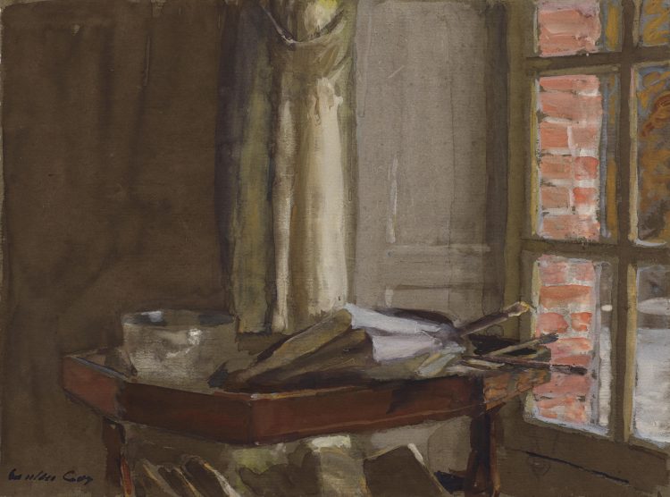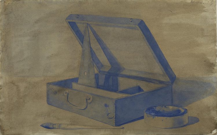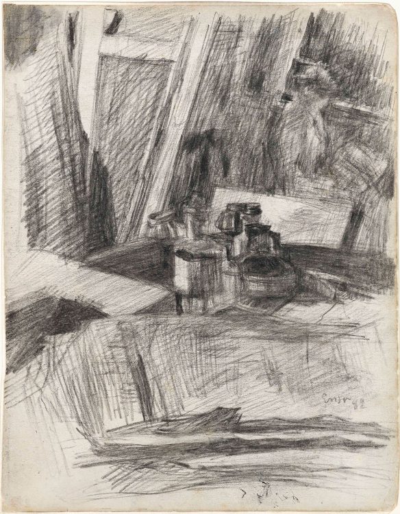 While artists’ tools feature in nearly all of the collection’s works, in this group they are allowed to take centre stage. Whether arranged in a still-life composition or shown as if only momentarily relinquished, representations of artists’ tools offer insights into the intimate space of the workshop. For artists across periods, such as François Bonvin and John Sergeant, their palettes, brushes, pencils and portfolios became favourite subjects to be lovingly and meticulously portrayed. Typical of his lively sketches of everyday objects, Adolphe von Menzel’s witty drawing brings his spectacles, penknife and quill to life.