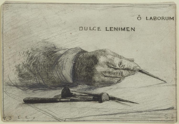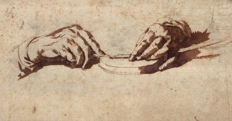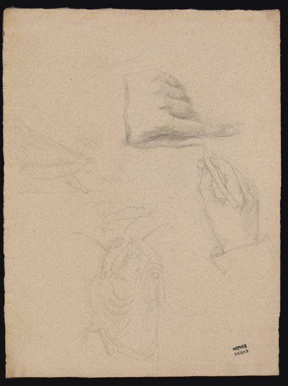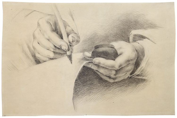 While artists’ hands at work are a common sight within the Katrin Bellinger collection, this selection is devoted to works that thematise the hand as the primary object of investigation. The group features hands drawing, writing, painting, and sculpting, but also hands sharpening quills and cleaning brushes. Notoriously difficult to depict, hands have always been a challenging subject-matter for artists, often serving as a testing ground for their skills in representation. Even more testing is to draw one’s own hands. Just as, with the aid of a mirror, training artists turn to their own faces as a readily available subject, so they may also study their hands, as we see in Edgar Degas’ drawing of his right hand sketching his left.