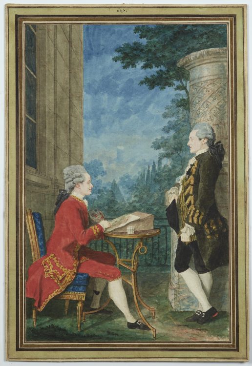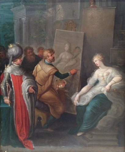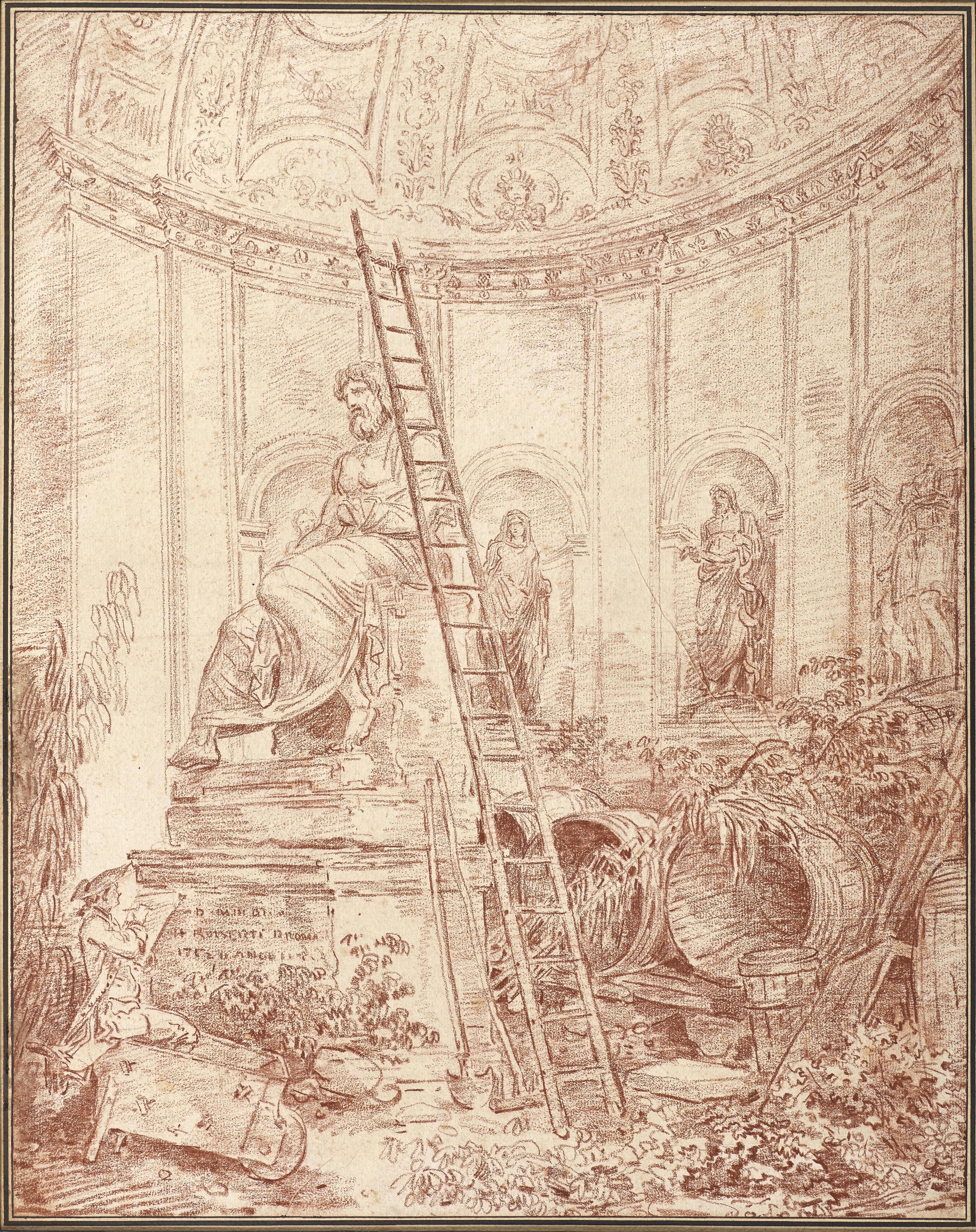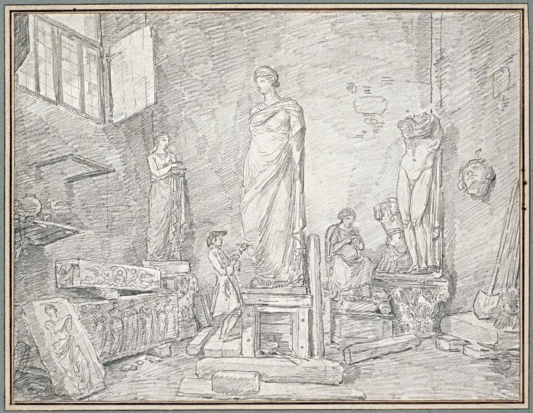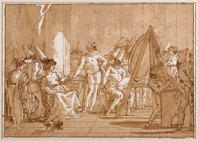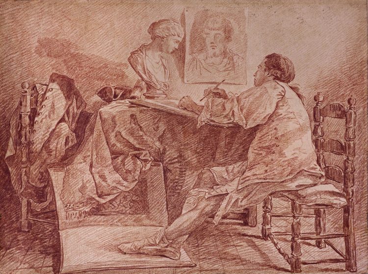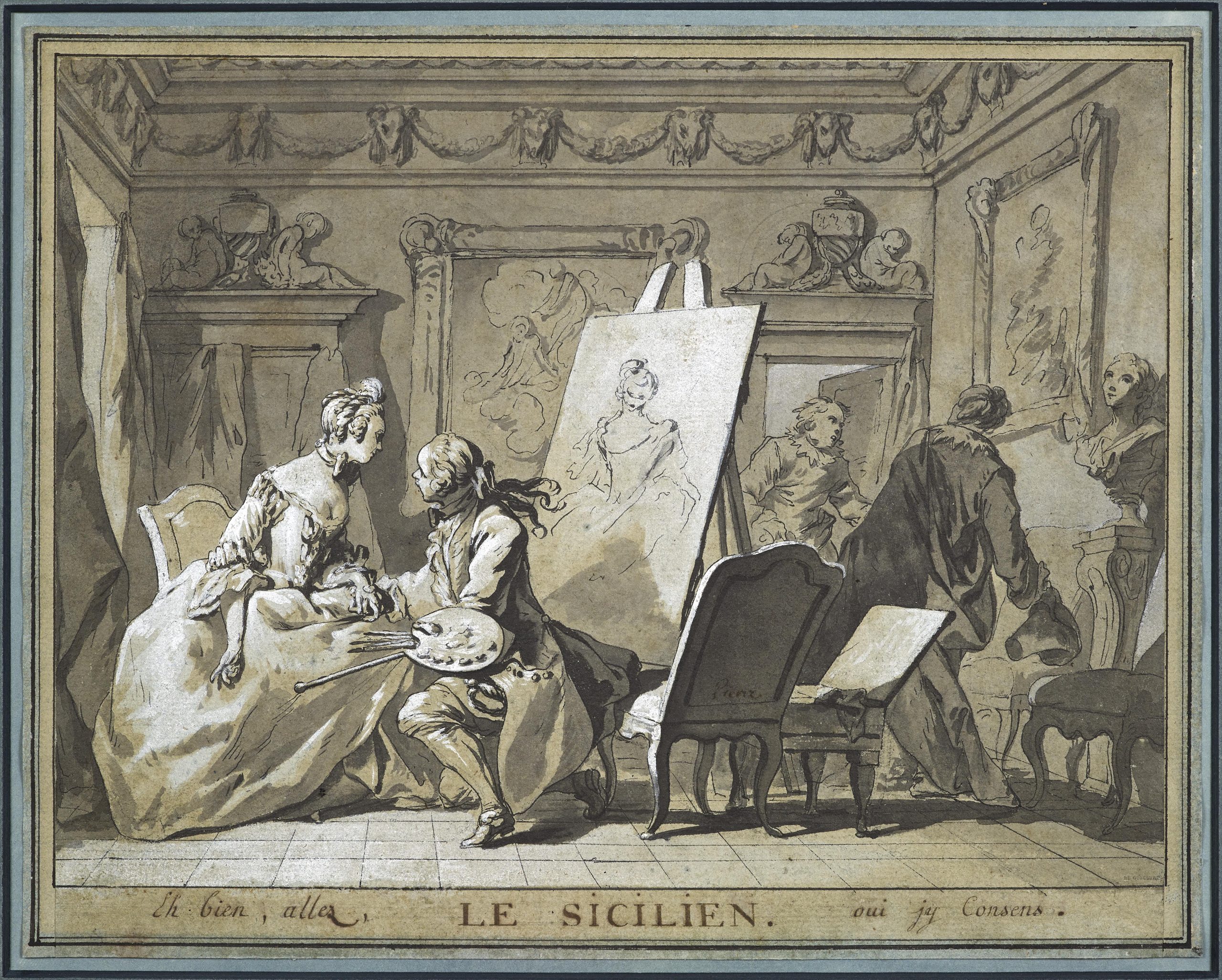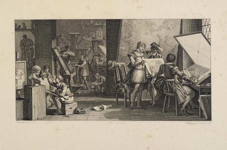 The sisterhood between the Arts is at the centre of Michel François Dandré-Bardon’s drawing and Daniel Berger’s print after Angelica Kauffman. While a light-hearted sketch by Pietro Testa adds a hint of irony to the traditional paragone, or rivalry, between painting and sculpture, by exaggerating the latter’s creative frenzy.