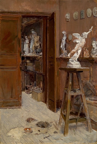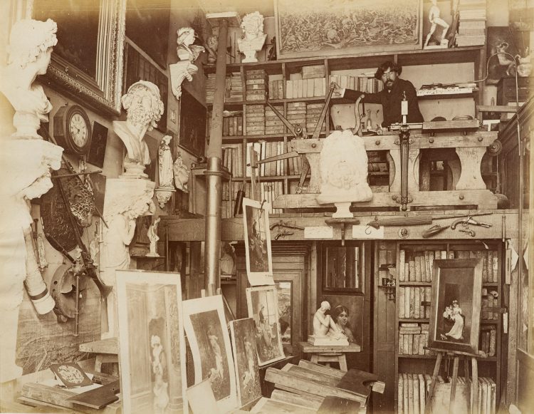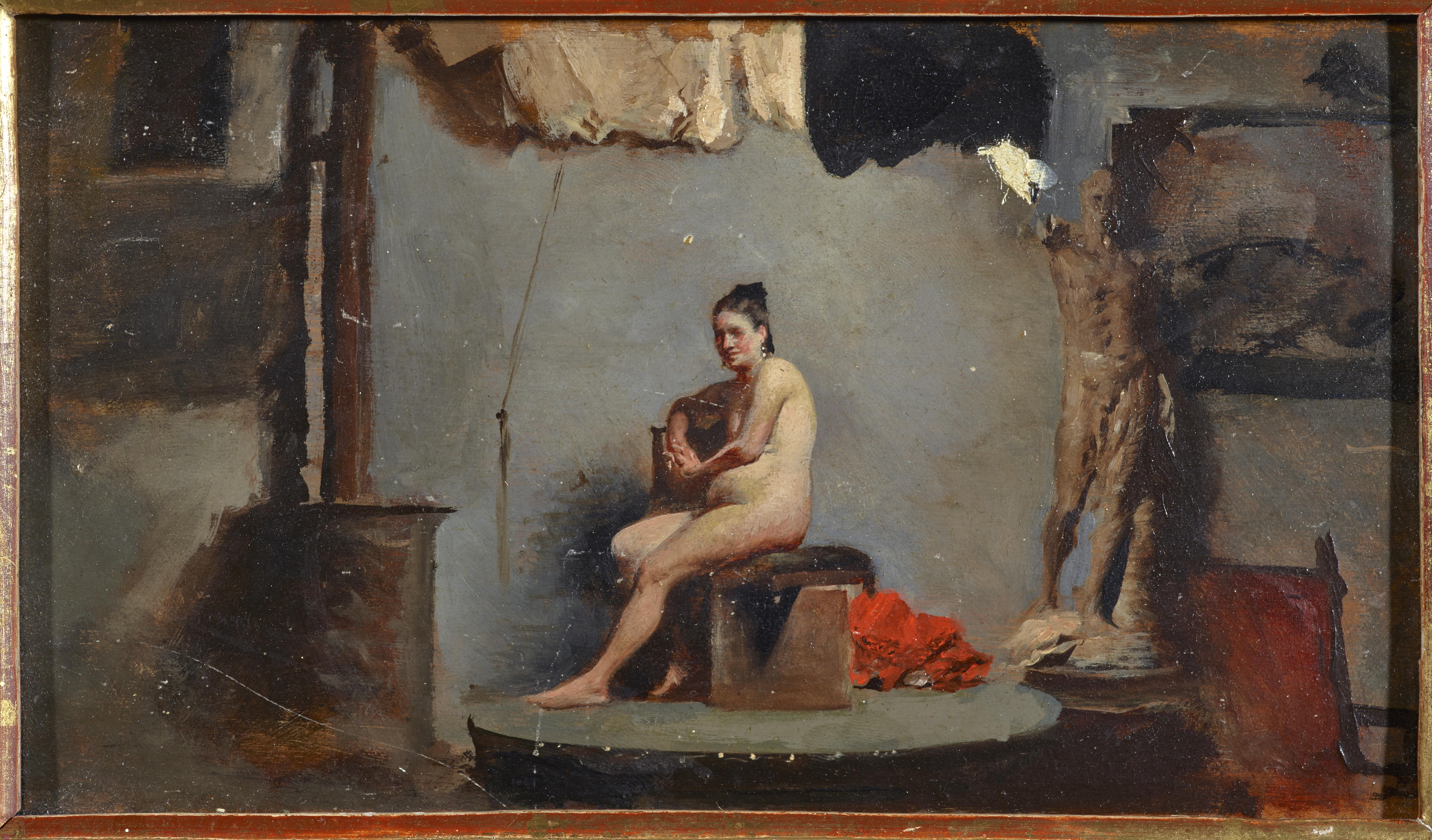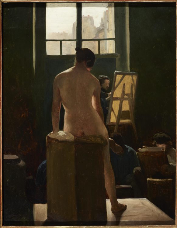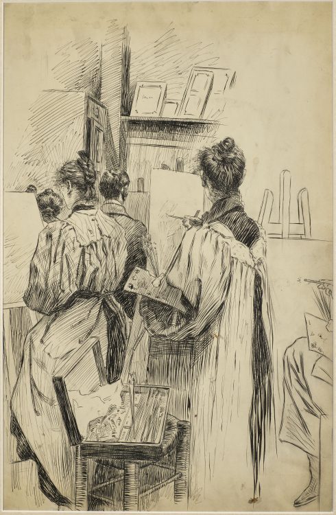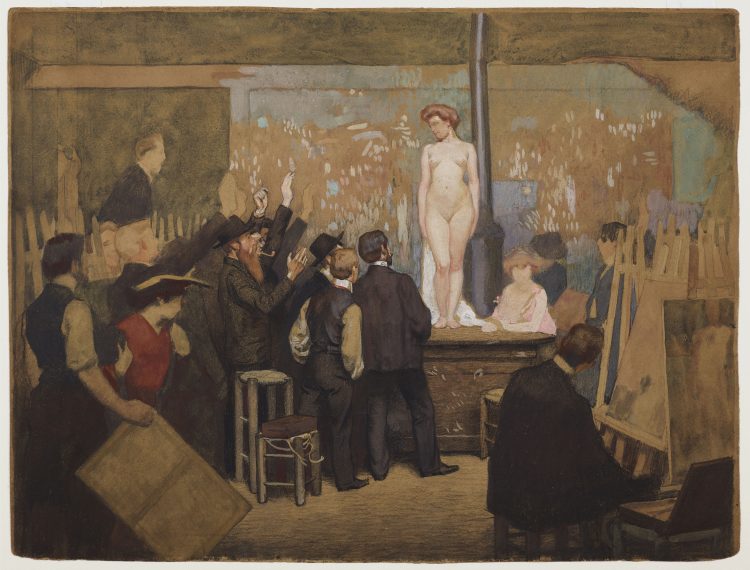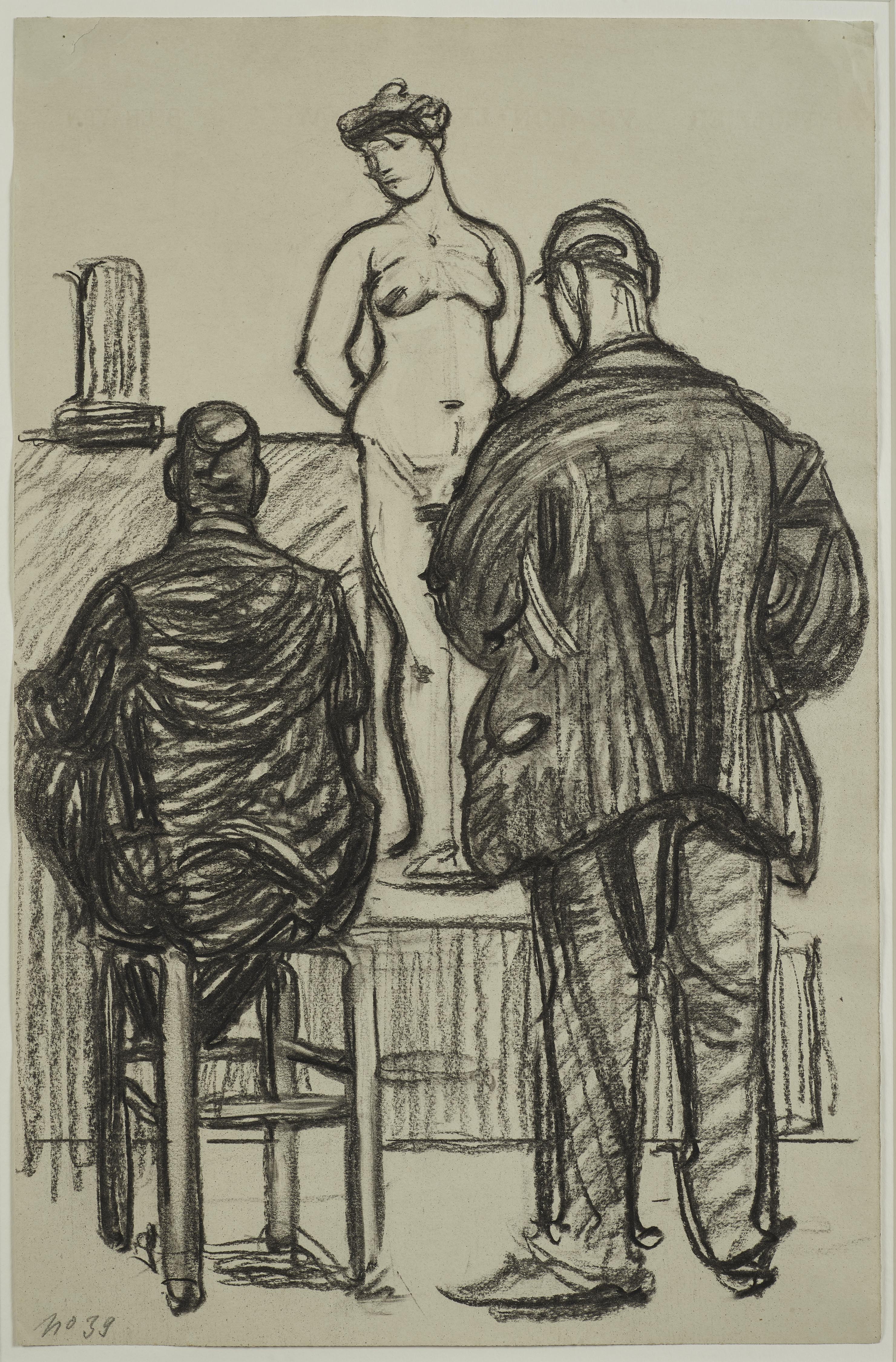 In the second half of the 19th century, with the rise of realism, the demand for models of both genders increased exponentially. Although female models were a common sight by that point, a certain uneasiness endured. A flurry of images exposes the unsettling relationship between the overwhelmingly male cohort of artists and the exposed body of the model. By playing with multiple levels of gaze, Georges Paul Leroux’s and Maxime Dethomas’s drawings blur the boundary between sanctioned practice and voyeurism.