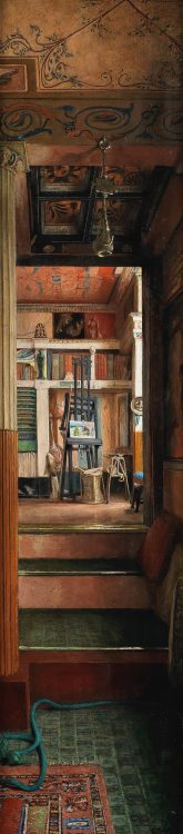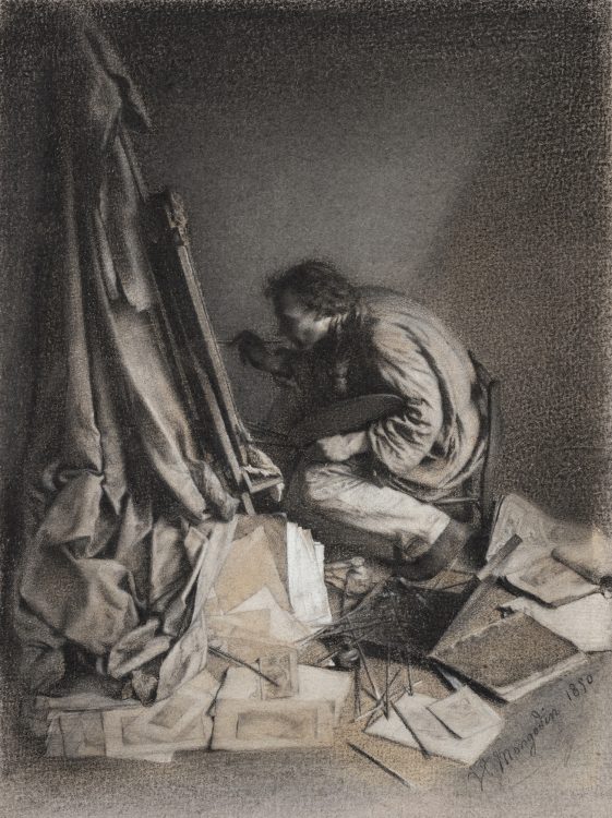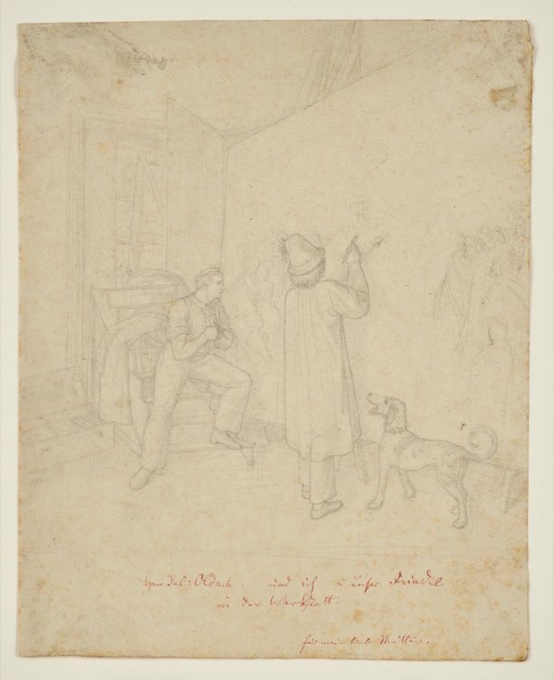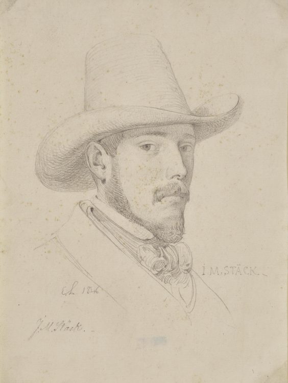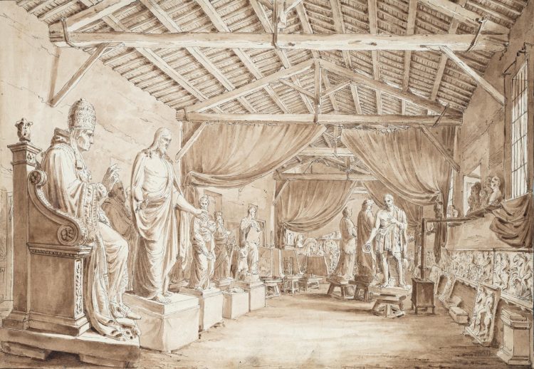 The collection’s geographic scope was recently broadened by several drawings that reveal connections between Italy and Scandinavia. Many young artists came to Rome to study with the Danish master Bertel Thorvaldsen, and Luigi Ricciardelli’s drawing of The Great Studio of Bertel Thorvaldsen in Rome (c. 1829) emphasizes the grandeur of the sculptor’s studio. The Swedish artists Egron Lundgren and Joseph Magnus Stäck both frequented such Scandinavian circles in Rome in the 1840s, exemplified by Lundgren’s subtle friendship portrait of Stäck.