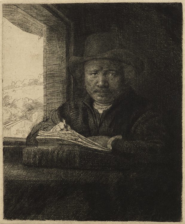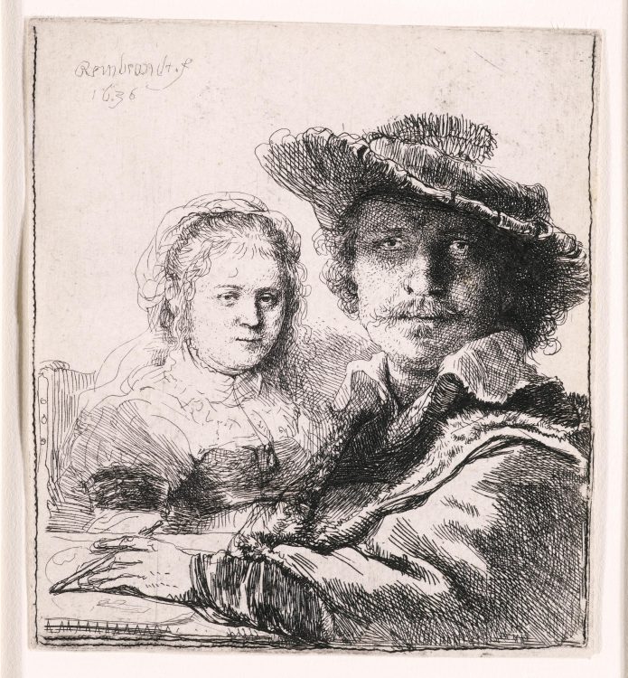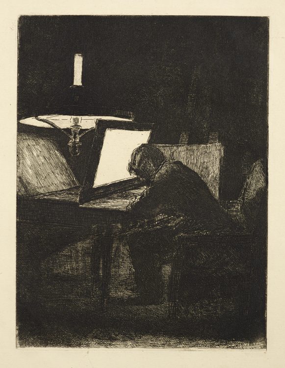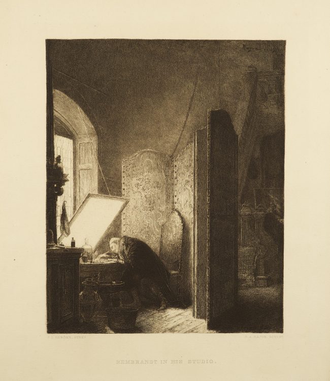 Most images focus on the figure of the painter-etcher working in his studio in solitude. This format is, at least in part, inspired by Rembrandt’s self-portraits and by the mystique surrounding his persona. As well as promoting his skills in his innovative prints, the Dutch master also cultivated his own image, becoming the quintessential artists’ artist. The 19th-century cult of Rembrandt is exemplified by Paul-Adolph Rajon’s etching after a painting by Jean-Léon Gérôme, Rembrandt biting an etched plate (now lost). With the foundation of the Sociéte des Aquafortistes in 1862, the scene was set for the etching revival, which took hold in France, England and the United States. Images of artists making etchings, as well as engravings, woodcuts and lithographs, proliferate in the 20th and 21st centuries.