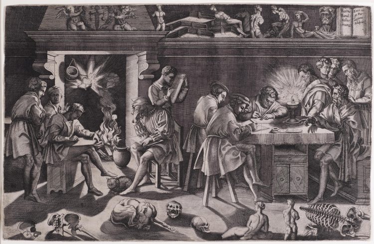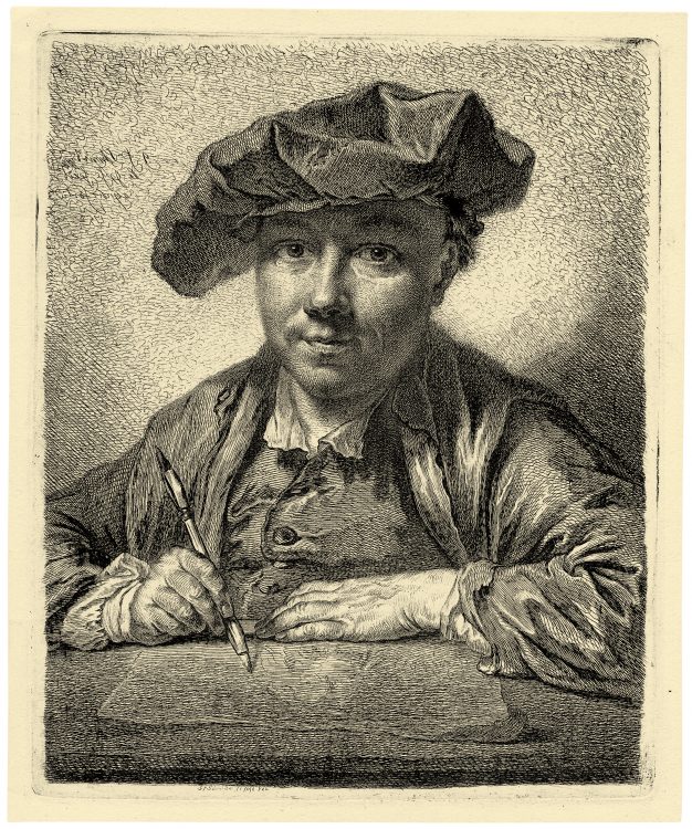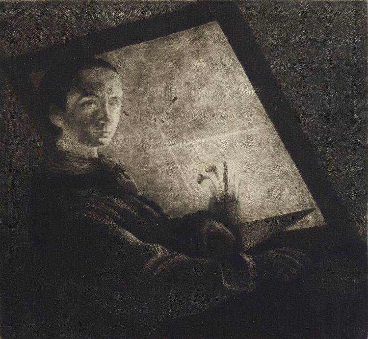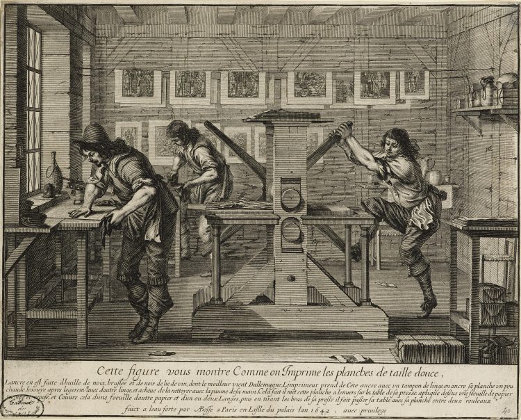 Abraham Bosse’s famous prints focus on the commercial printmaking workshop and have an informative function. Pierre Baquoy’s later example shows an atelier teeming with assistants, each tasked with a different step in the printing process. In the right foreground, the master engraver inspects an impression. Over his workspace, a light diffusing screen is deployed to soften the light hitting the reflective surface of the plate. This device, seen in several of the works in this group and still in use today, allows the artist to create subtle values undisturbed by the glimmer of the metal.