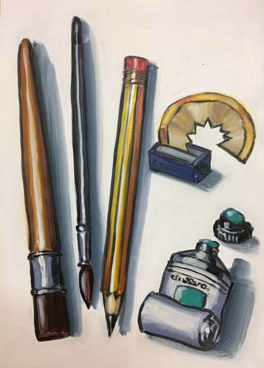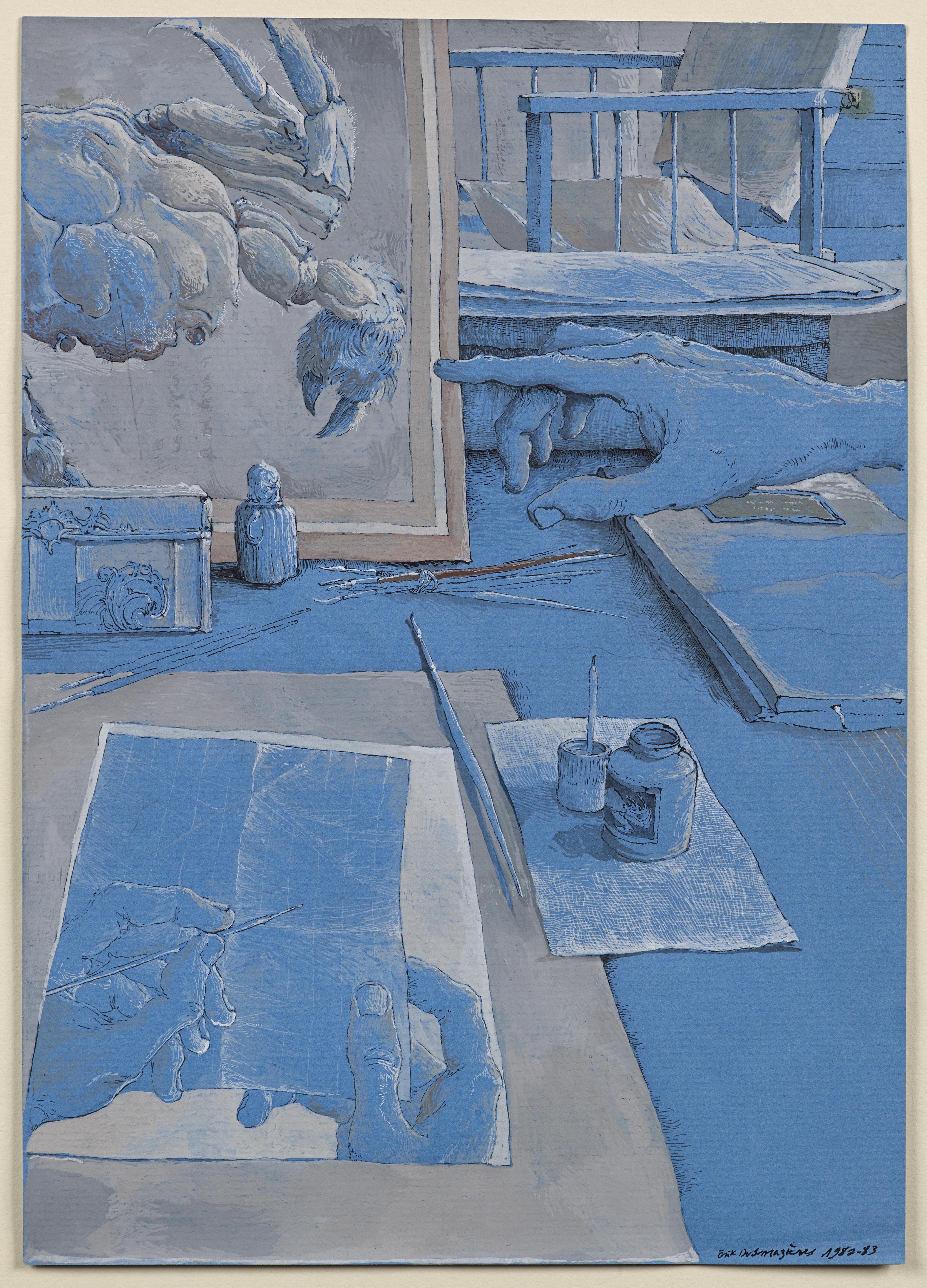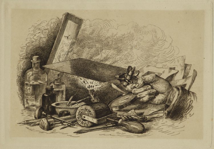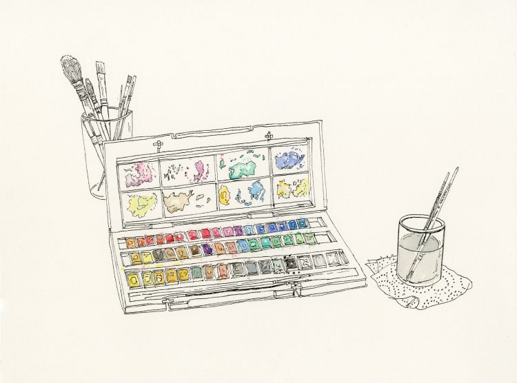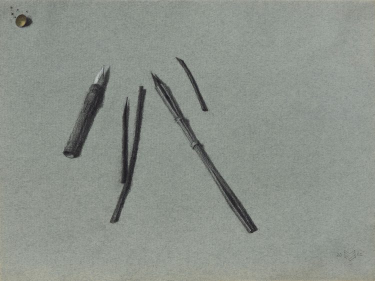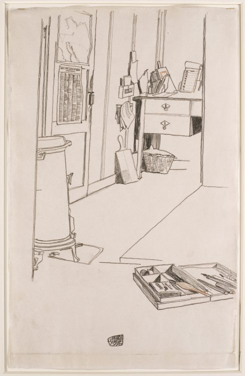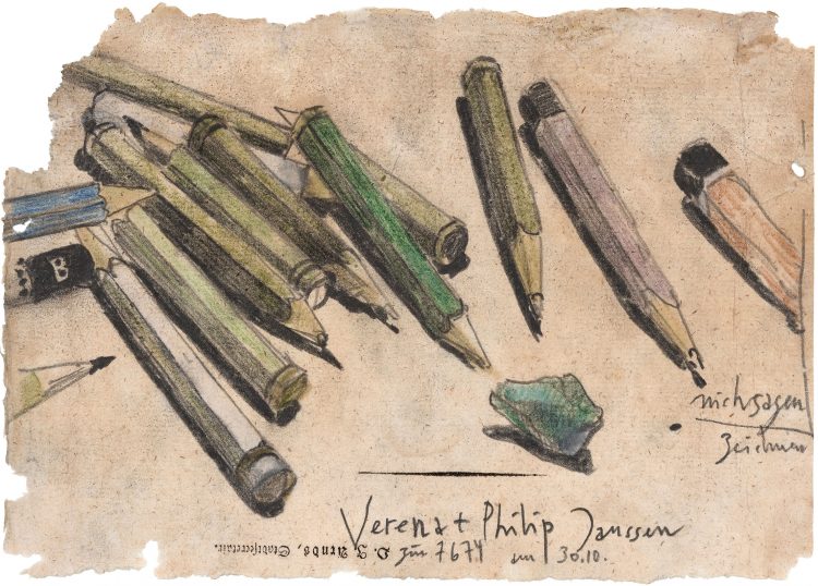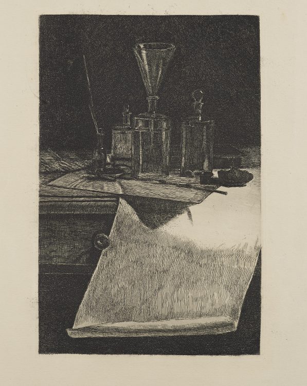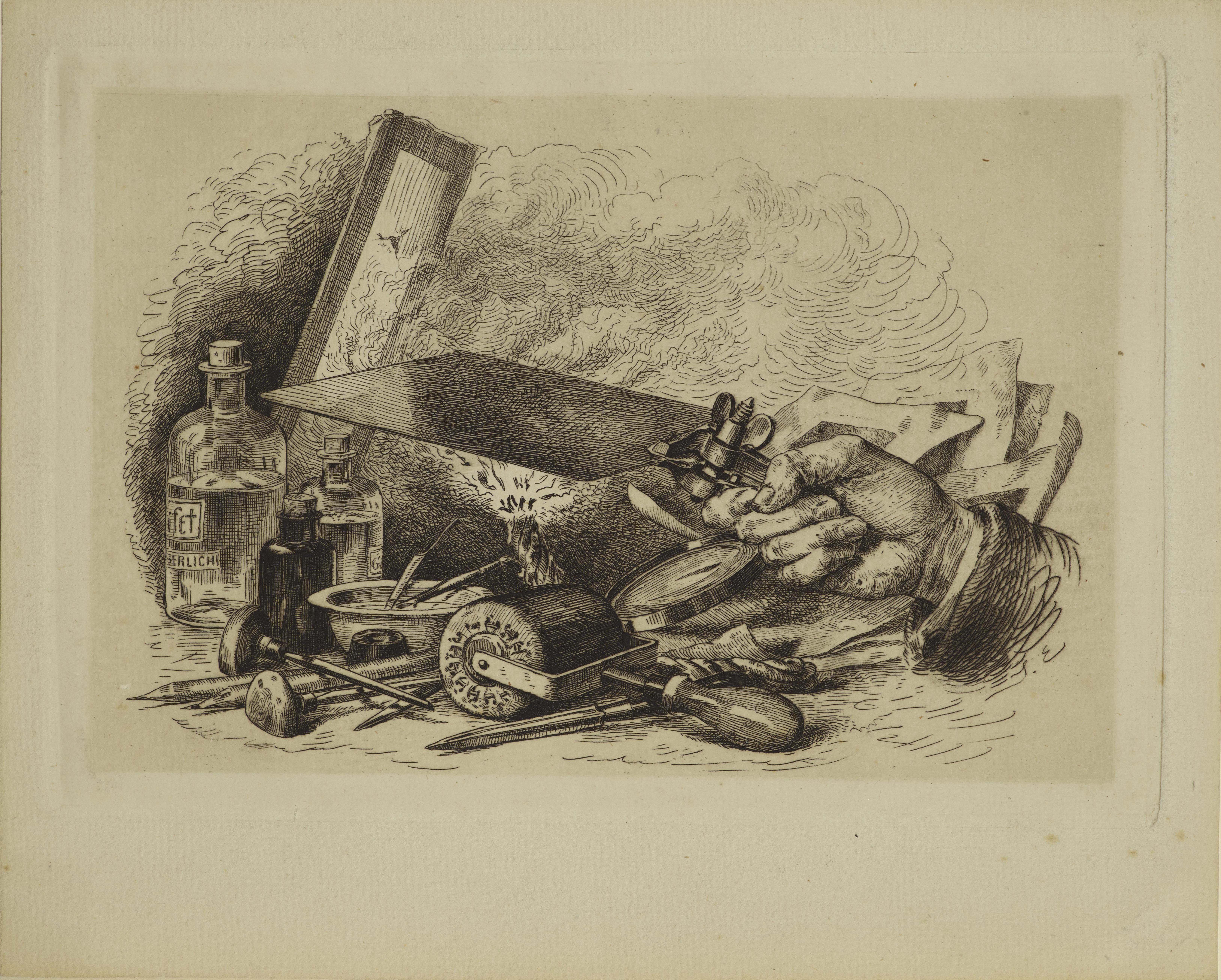 Artists have always enjoyed depicting their tools and workspaces. Whether for didactic purposes or as means of self-expression, tools such as pens, brushes, ink pots, paint boxes and paper constitute a captivating subject for artists working across media and styles. This varied selection from the Katrin Bellinger collection exemplifies well the fascination with studio miscellanea and the tools of the trade.