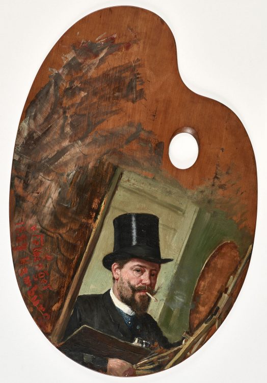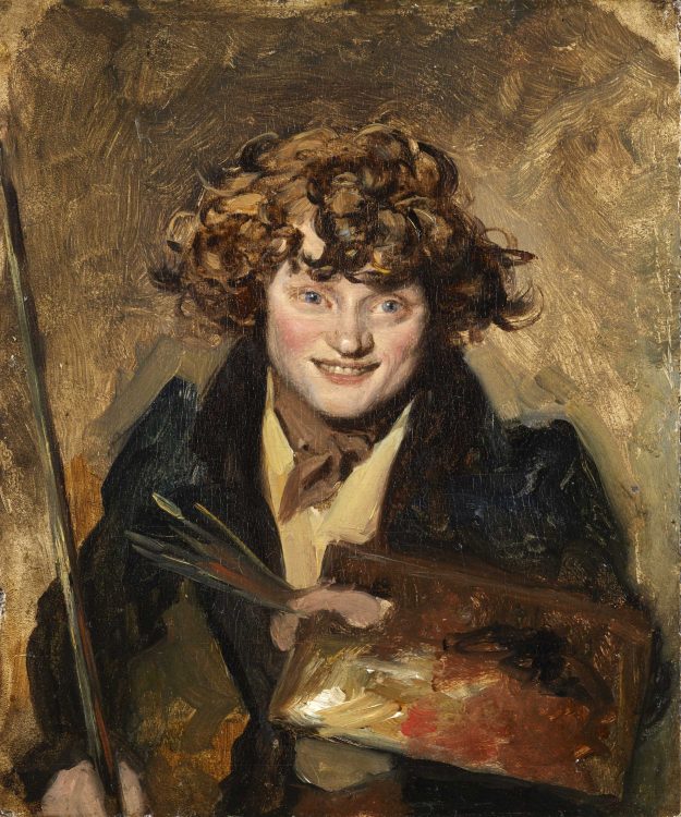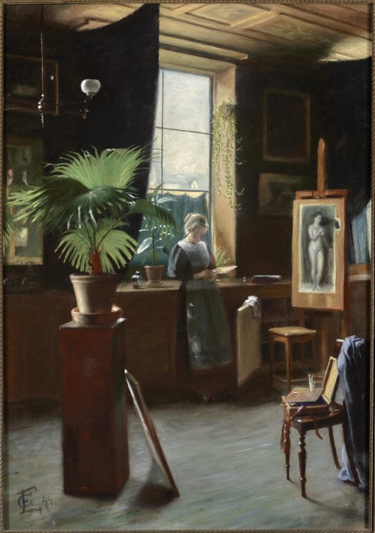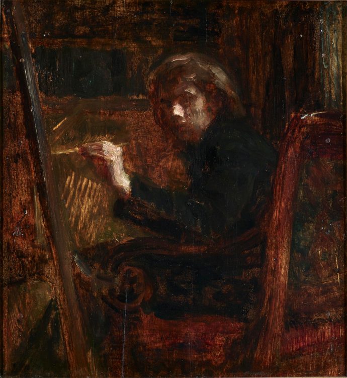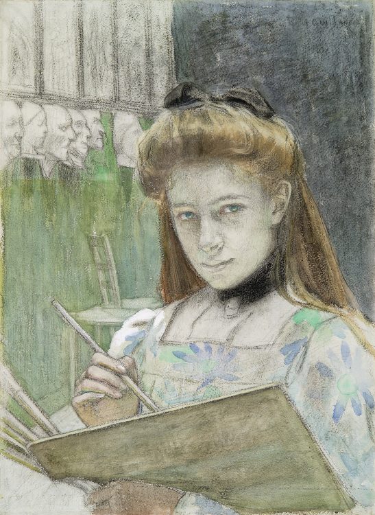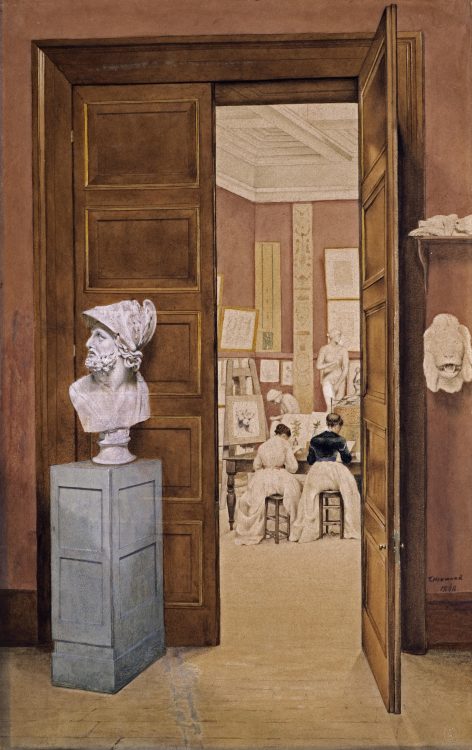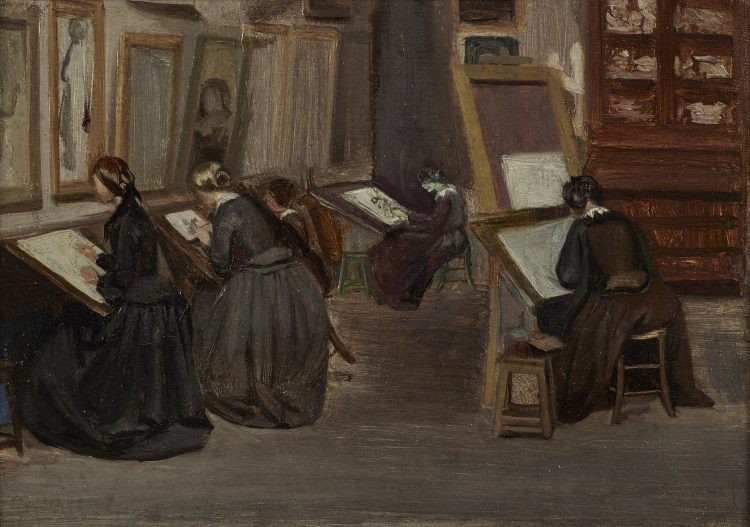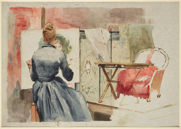 In the second half of the 19th century, access to formal training became progressively more open to women, with private art schools first seeing the benefits in admitting female pupils. Rose Marie Guillaume’s watercolour is set at the renowned Académie Julian in Paris, where she trained and taught, in a separate studio reserved for female students only. Larger institutions slowly followed suit. The London Royal Academy of Arts began admitting women in 1860 – although they could not attend life-drawing classes there until 1893 – and the École des Beaux-Arts in Paris finally opened its doors to female students in 1897. Late 19th-century self-portraits with palette and brushes symbolize the ambitious and self-confident woman artist. The struggle for access and recognition continued throughout the 20th and 21st centuries and arguably up to the present day, with the self-portrait and the studio view still acting as powerful vehicles for the negotiation of women’s artistic identity.