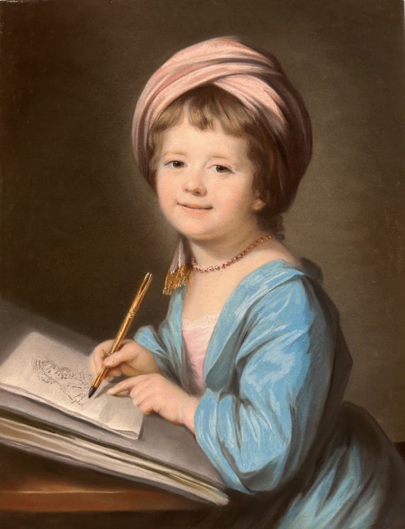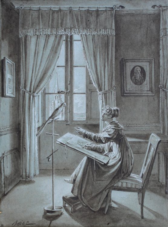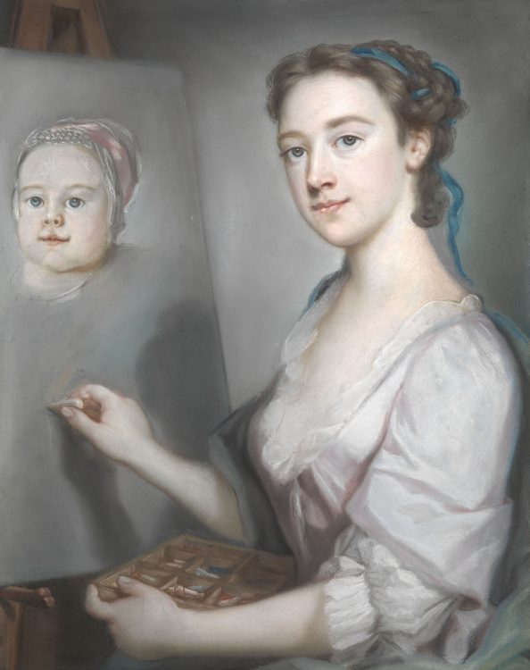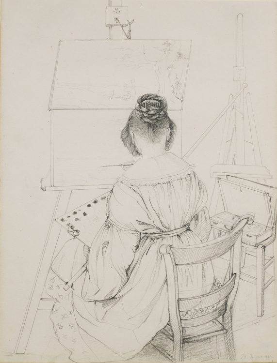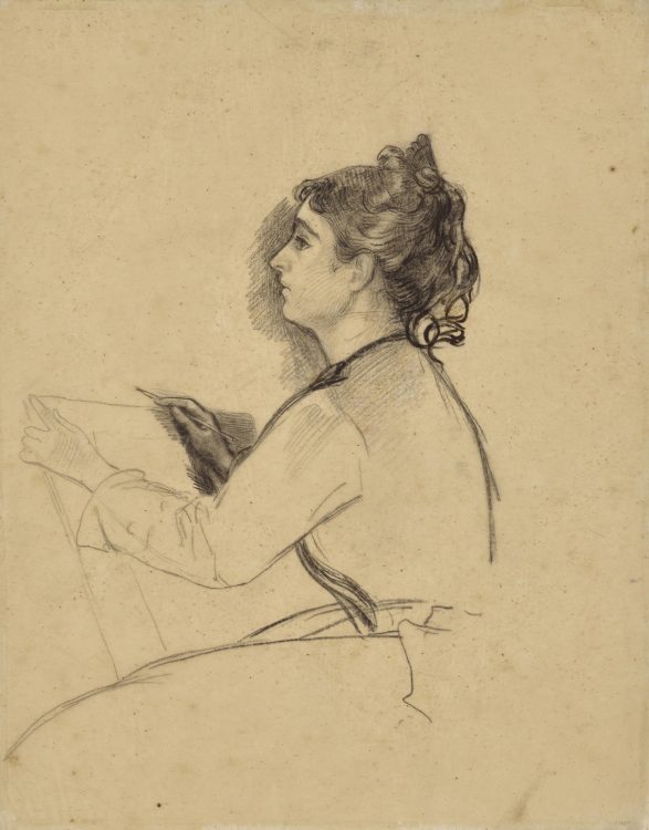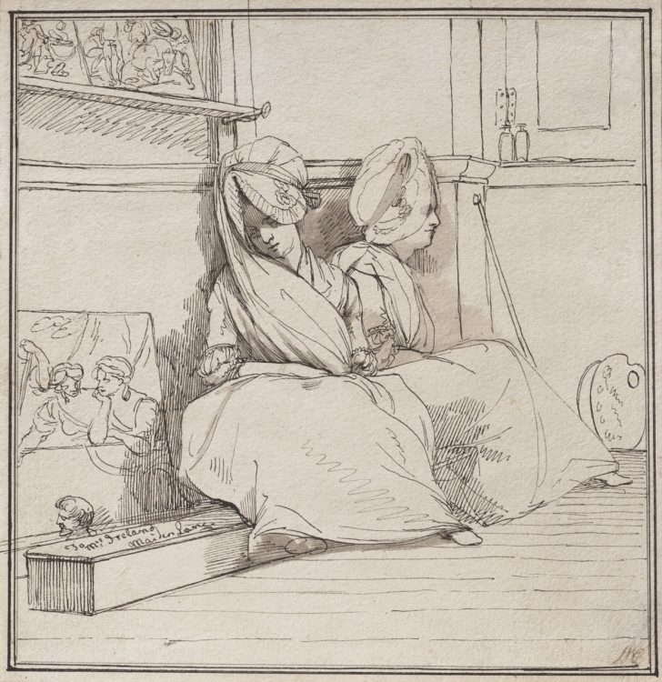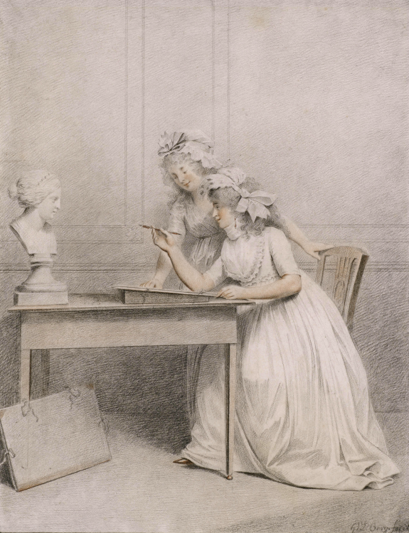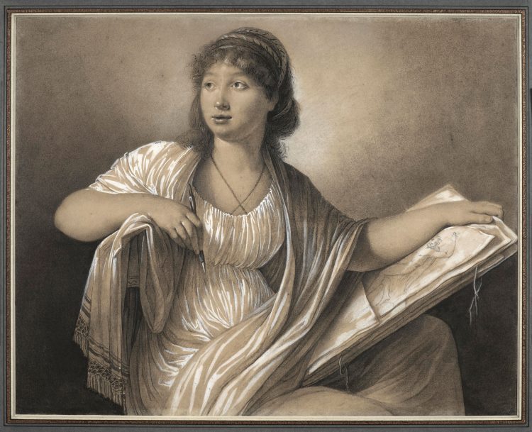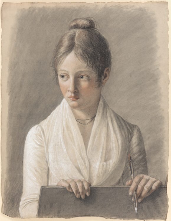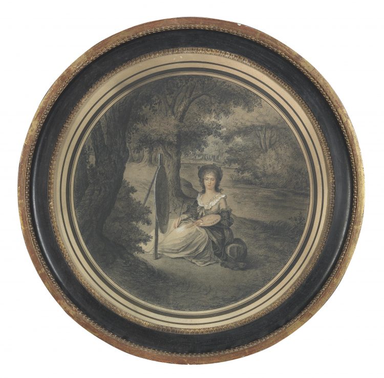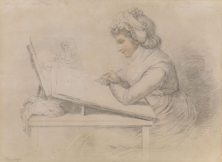 While some of the works are self-portraits, others were made by the artists’ teachers, husbands, and fellow art school students. Aside from a few exceptions, their identity is unknown and from the manner in which they are portrayed it is not always possible to ascertain if these women were professionals or amateurs. Up to the 19th century, young women wishing to learn how to draw were usually taught by a family member or an established artist, as illustrated in Francesco Bartolozzi’s and Arthur Pond’s drawings.