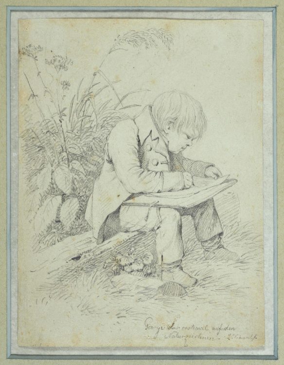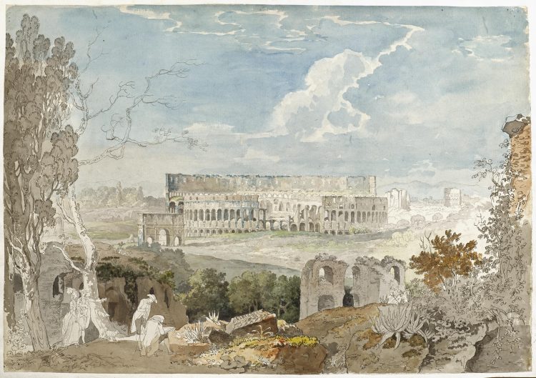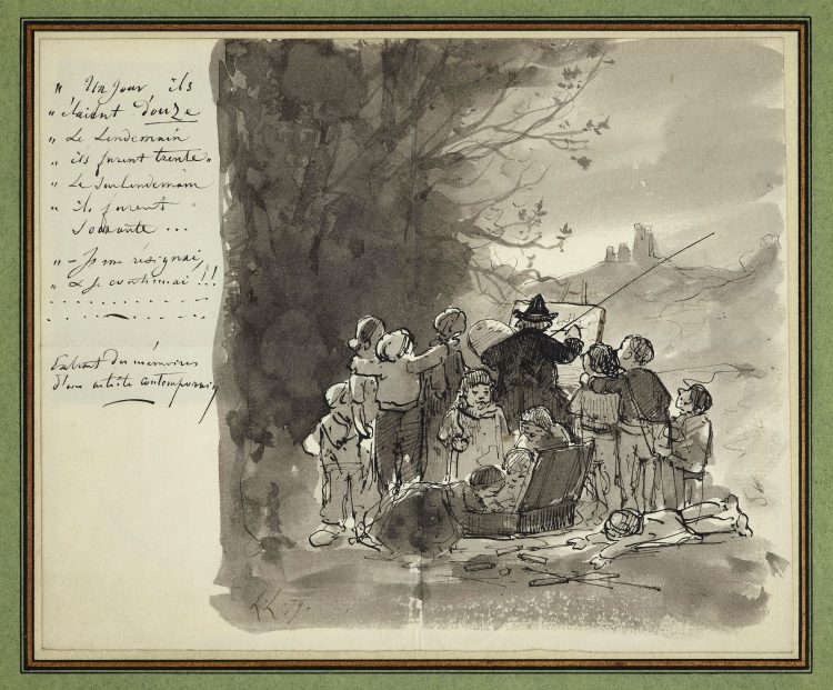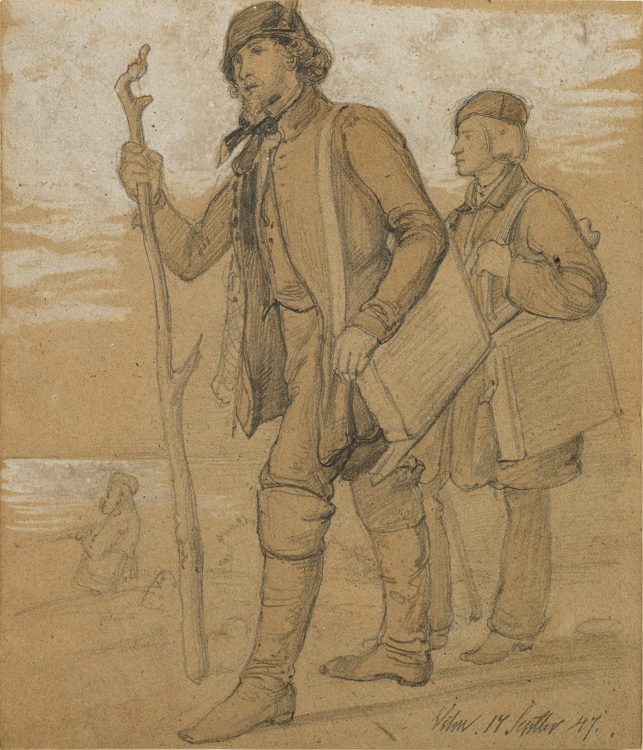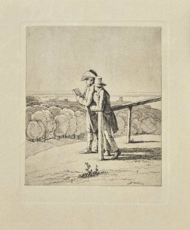 From the late 18th century onwards sketching excursions with fellow artists became common practice, as shown in the drawings and prints of Friedrich Preller the Elder, Johann Adam Klein and Wilhelm von Kobell. Thomas Rowlandson’s Artist travelling in Wales shows an elderly artist heavily laden with painting-materials in the pouring rain, making a witty commentary on the trials of the touring painter.