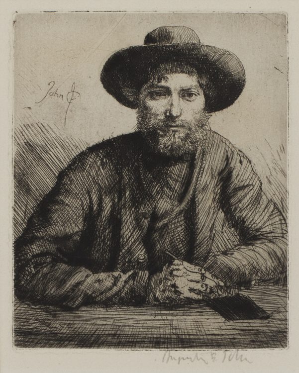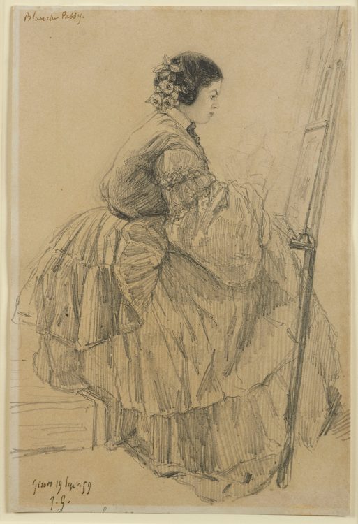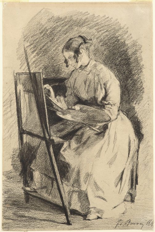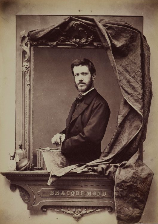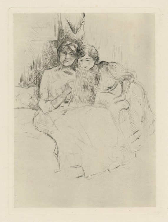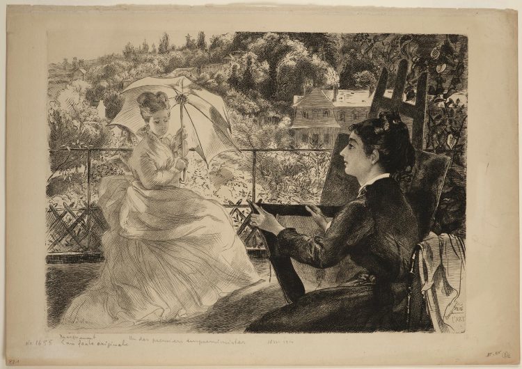 There are comparatively fewer women printmakers of this period, with a notable exception in Marie Bracquemond, who likely learned the technique from her husband Félix. A counterpoint to Marie’s own A woman artist at her easel, Félix’s etching La Terrasse depicts her at work at their home in Sèvres. Berthe Morisot also created a group of drypoints in 1889, including a delicate self-portrait drawing with her daughter Julie.