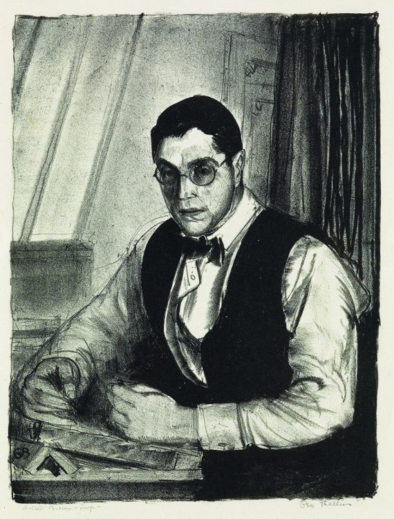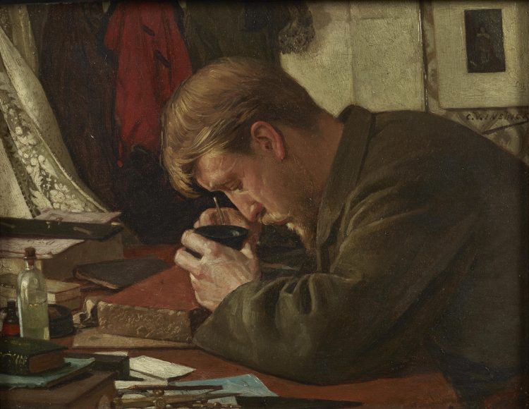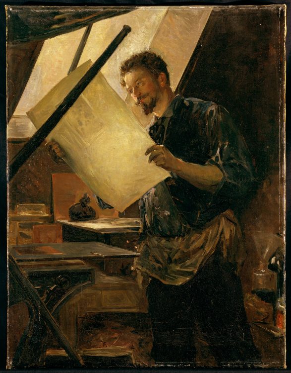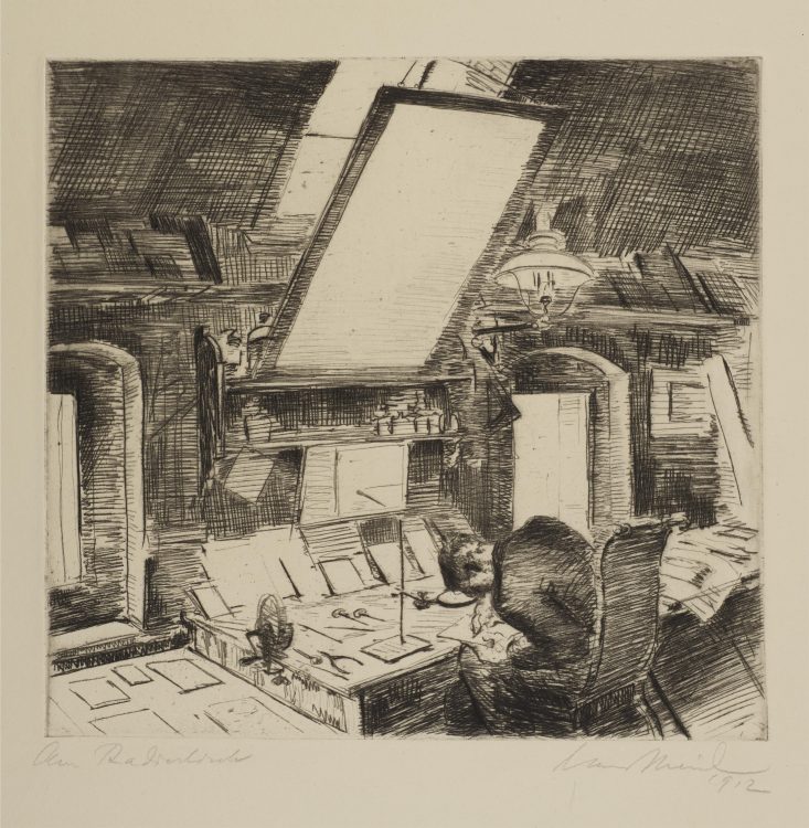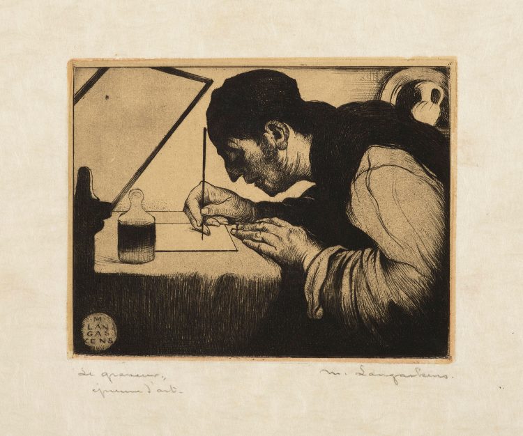 Other recently acquired prints from this period include portraits by Giovanni Boldini and Otto Greiner. Boldini was known for his flamboyant and expressive use of line, visible here in his dramatic drypoint of Adolph von Menzel. Otto Greiner similarly employed loose and animated lithographic strokes to produce a portrait of fellow painter Kopfstein. While the collection has several drawings by Greiner, this is the first lithograph by the artist to enter the collection. Also likely dating to the end of the nineteenth century, Charles Victor Ensinck’s oil on panel illustrates an anonymous lithographer in his studio, poring over a detailed passage on the stone.