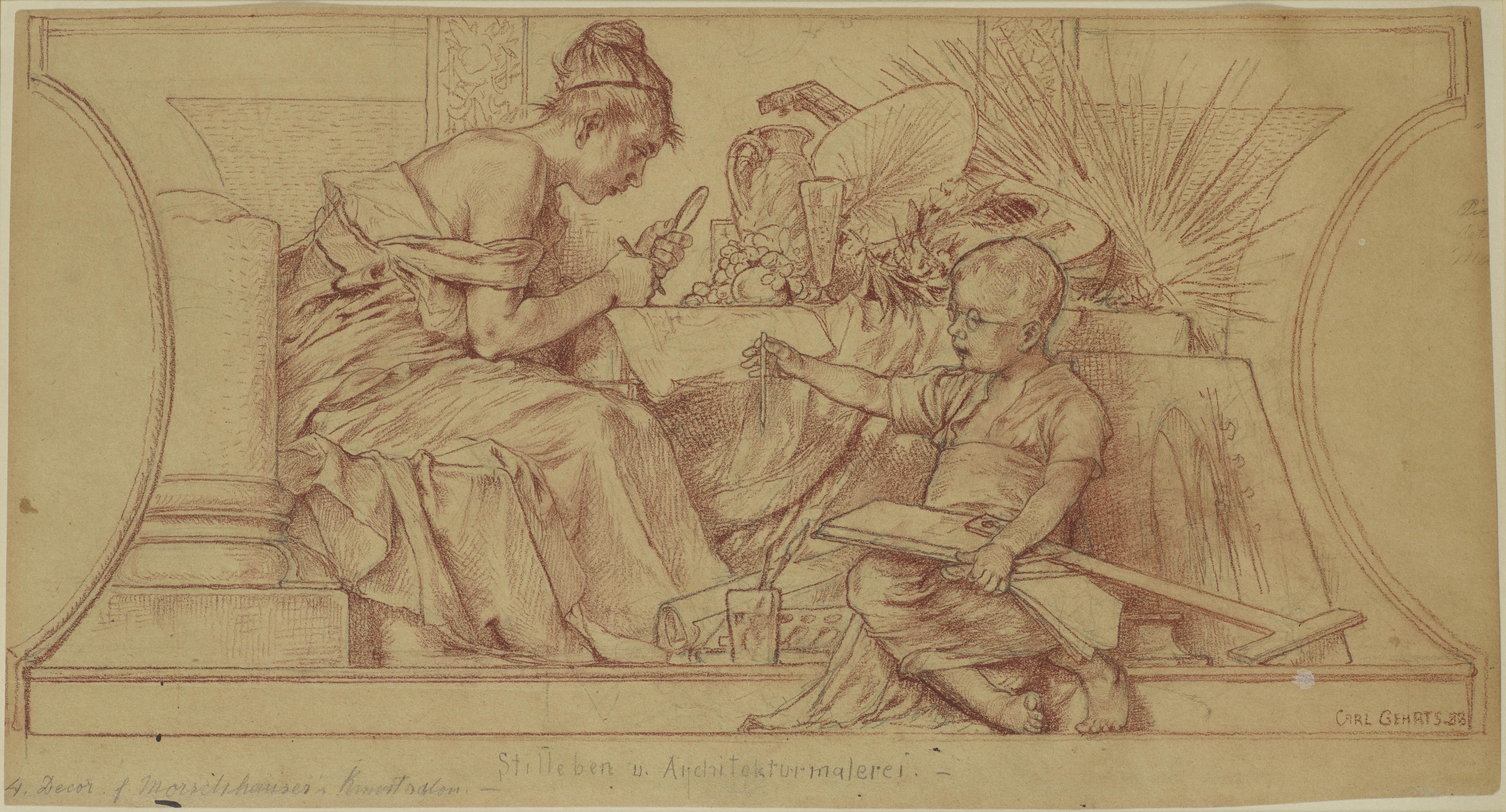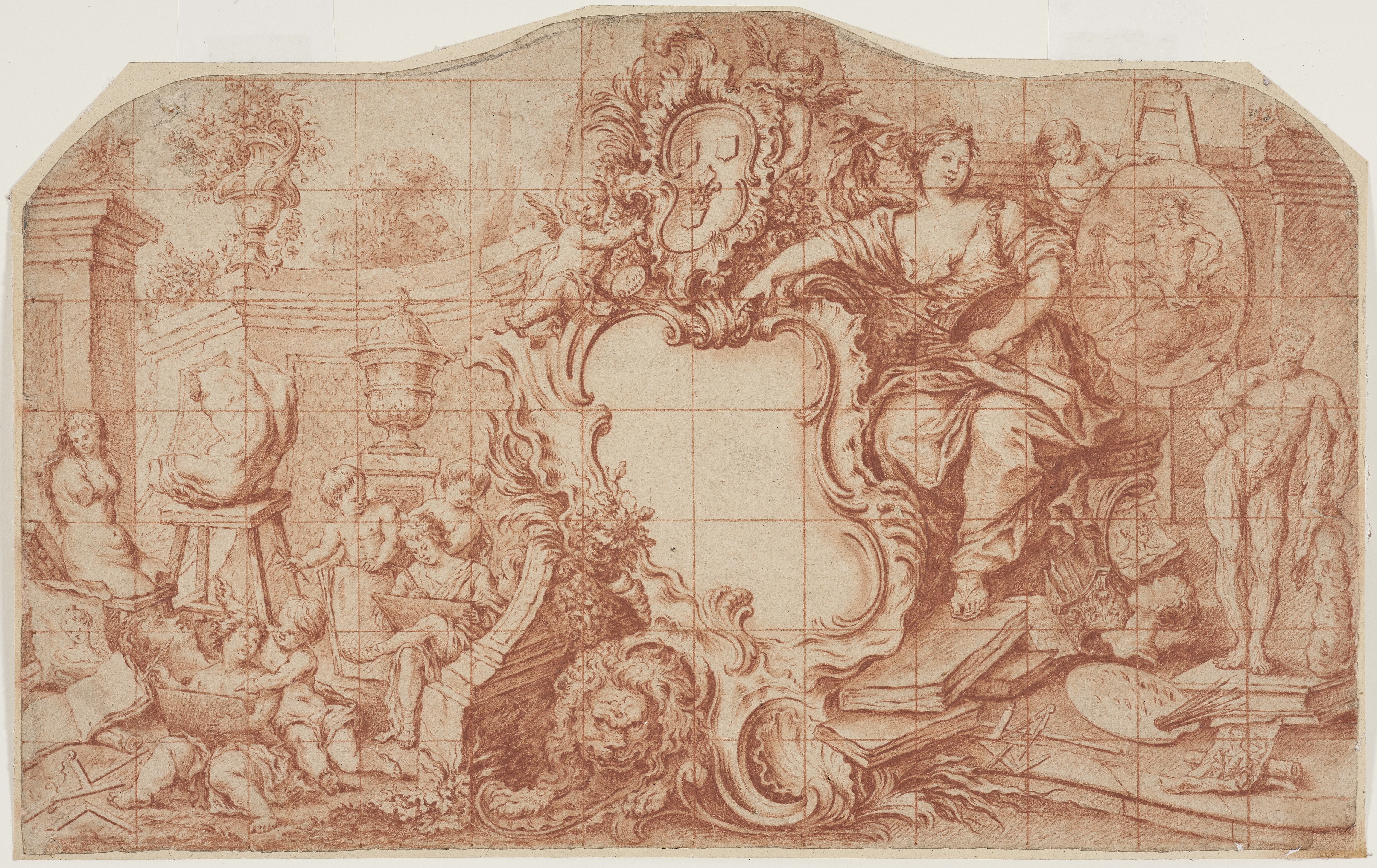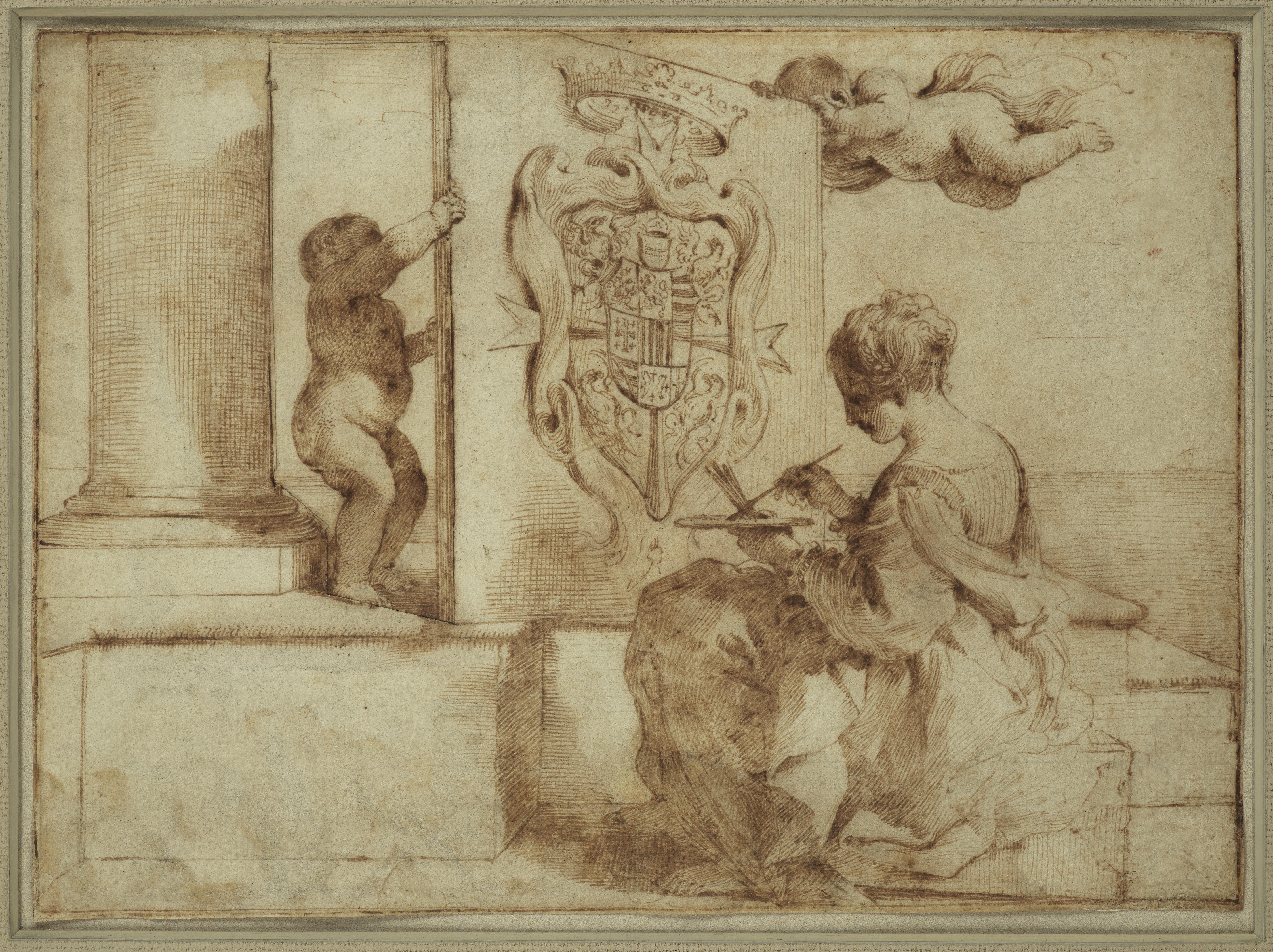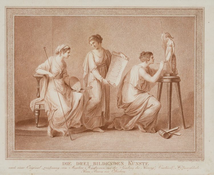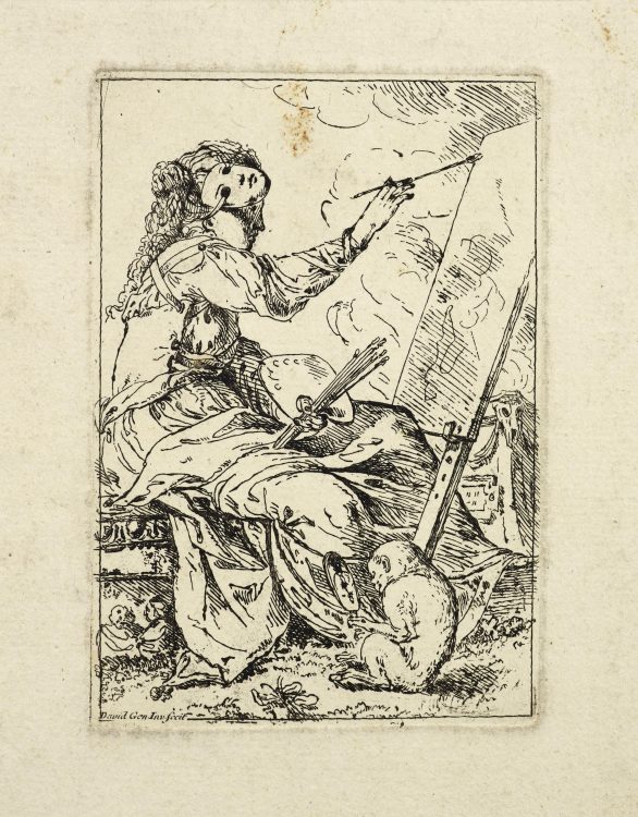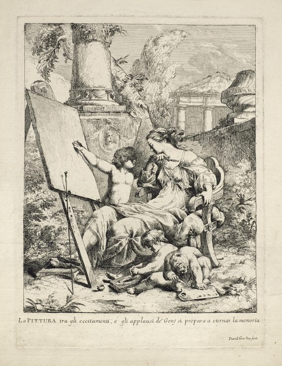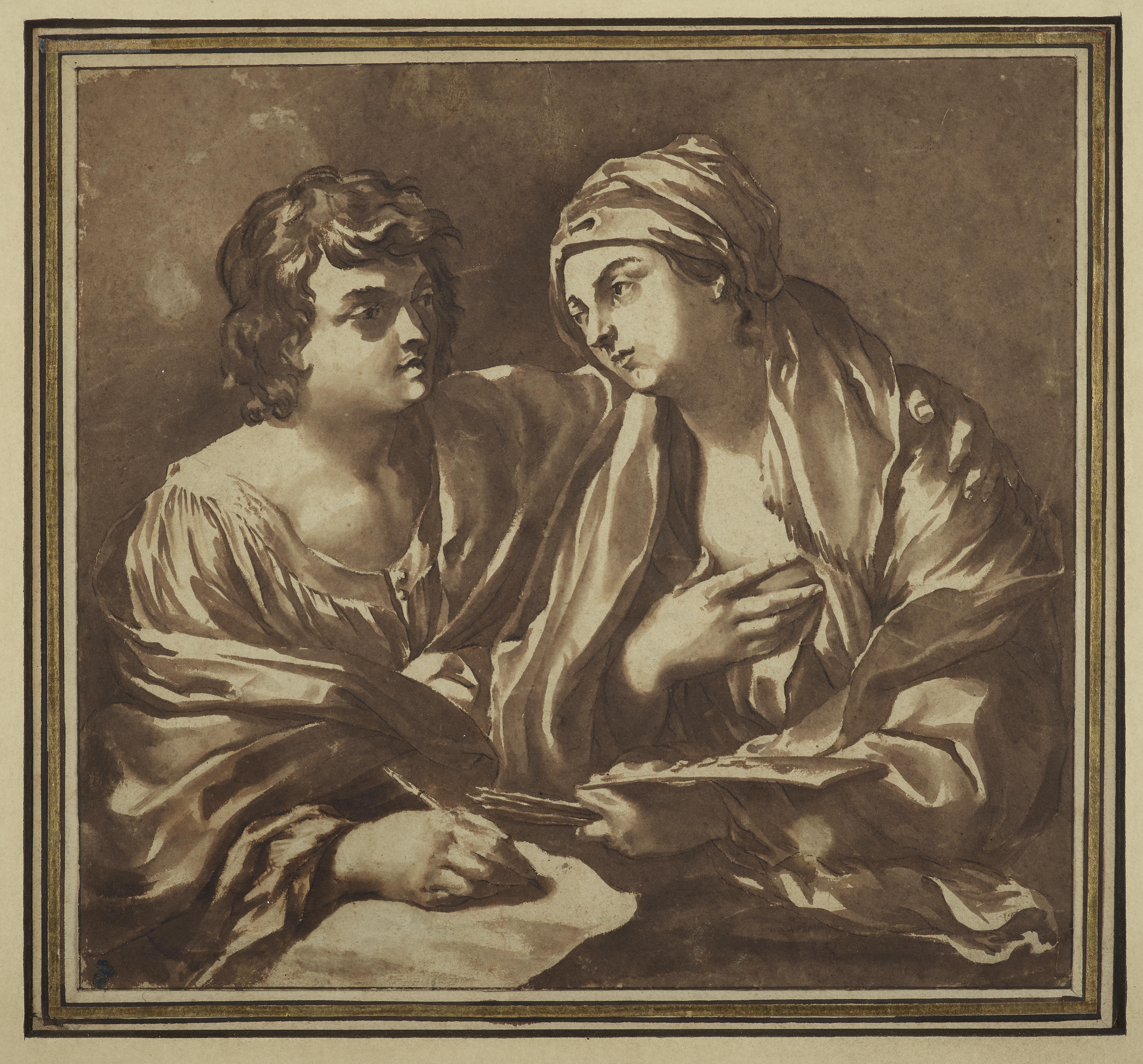 The tradition of representing painting, sculpture and architecture as female figures – abstract entities guiding the (usually male) artist to glory –, emerged during the sixteenth-century. In his Lives of the Artists, Giorgio Vasari described Painting, Sculpture and Architecture as the three Sister Arts all born from one father, Disegno, signifying both the act of drawing and the conceptual ideation of design. The ambition of Italian Renaissance artists to elevate the status of the visual arts from manual to intellectual activities thus resulted in their inclusion among the nobler Liberal Arts.