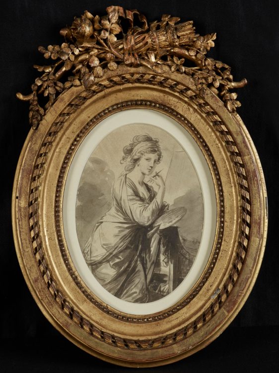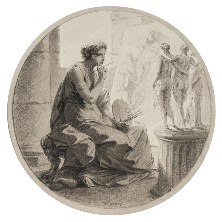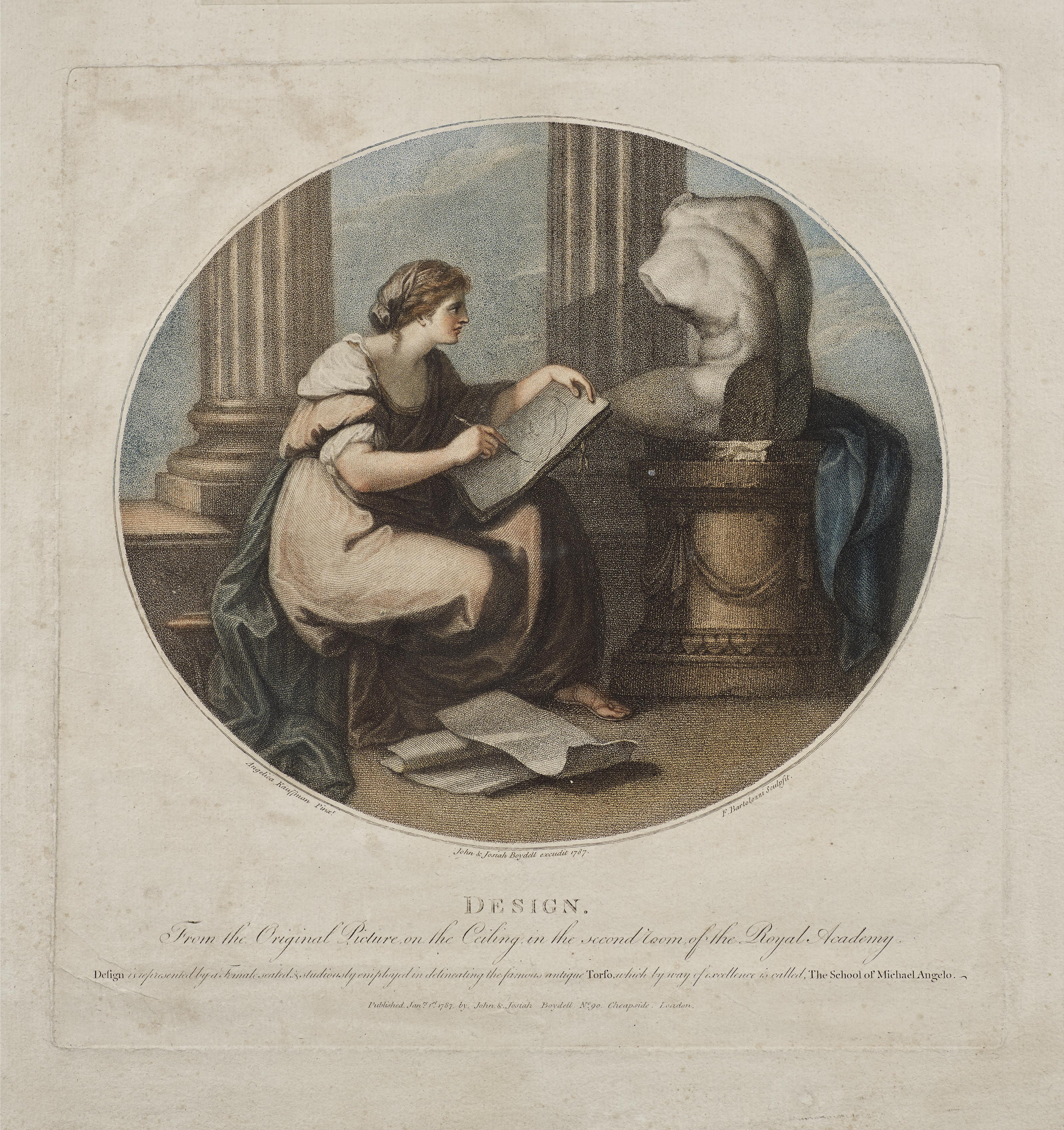 From the 17th century, the easily-blurred boundary between portraits of women painters and allegories of Painting allowed for ambitious affirmations of female agency in the arts. Much rarer is the representation of Design (in Italian, Disegno is a masculine noun) as a female artist intently studying a classical cast. In her ground-breaking work, one of her four Elements of Art painted for the ceiling of the Royal Academy’s Council Room in Somerset House, Angelica Kauffman reclaimed women’s proficiency in all realms of artistic creation.