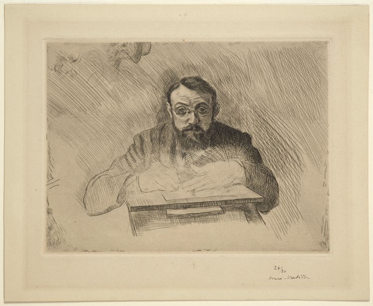 Increasingly, artists were involved in the actual process of printing their works: inking and paper selection were often done in close collaboration with master printers like Auguste Delâtre, captured at his press by Maximilien Luce. Delâtre is also the subject of a color etching by his son Eugène; notably, the impression in the collection is dedicated to the renowned writer Joris-Karl Huysmans. Henri Guérard, another printmaker who worked closely with Manet and the Impressionists, carefully inspects a print in an etching by his friend Norbert Goeneutte. Guérard would return the favor in his own portrayal of Goeneutte, Norbert Goeneutte á l’étude, Dieppe.