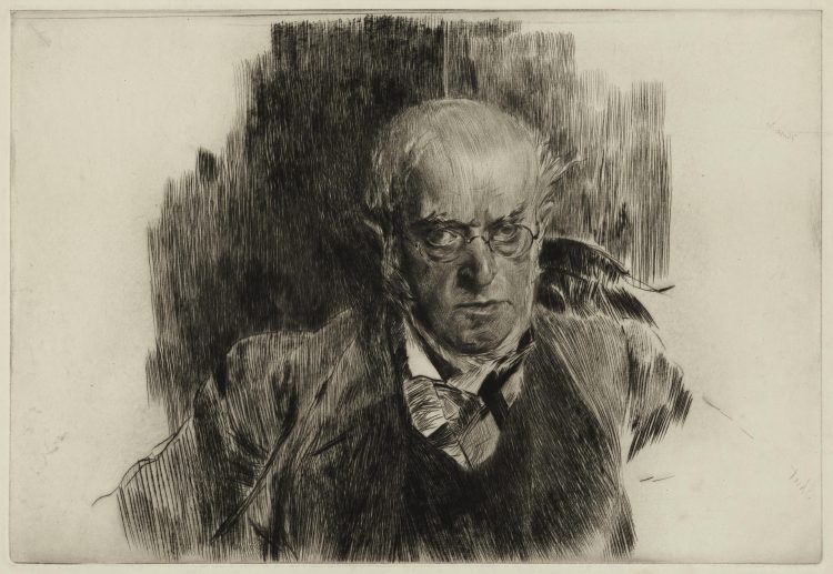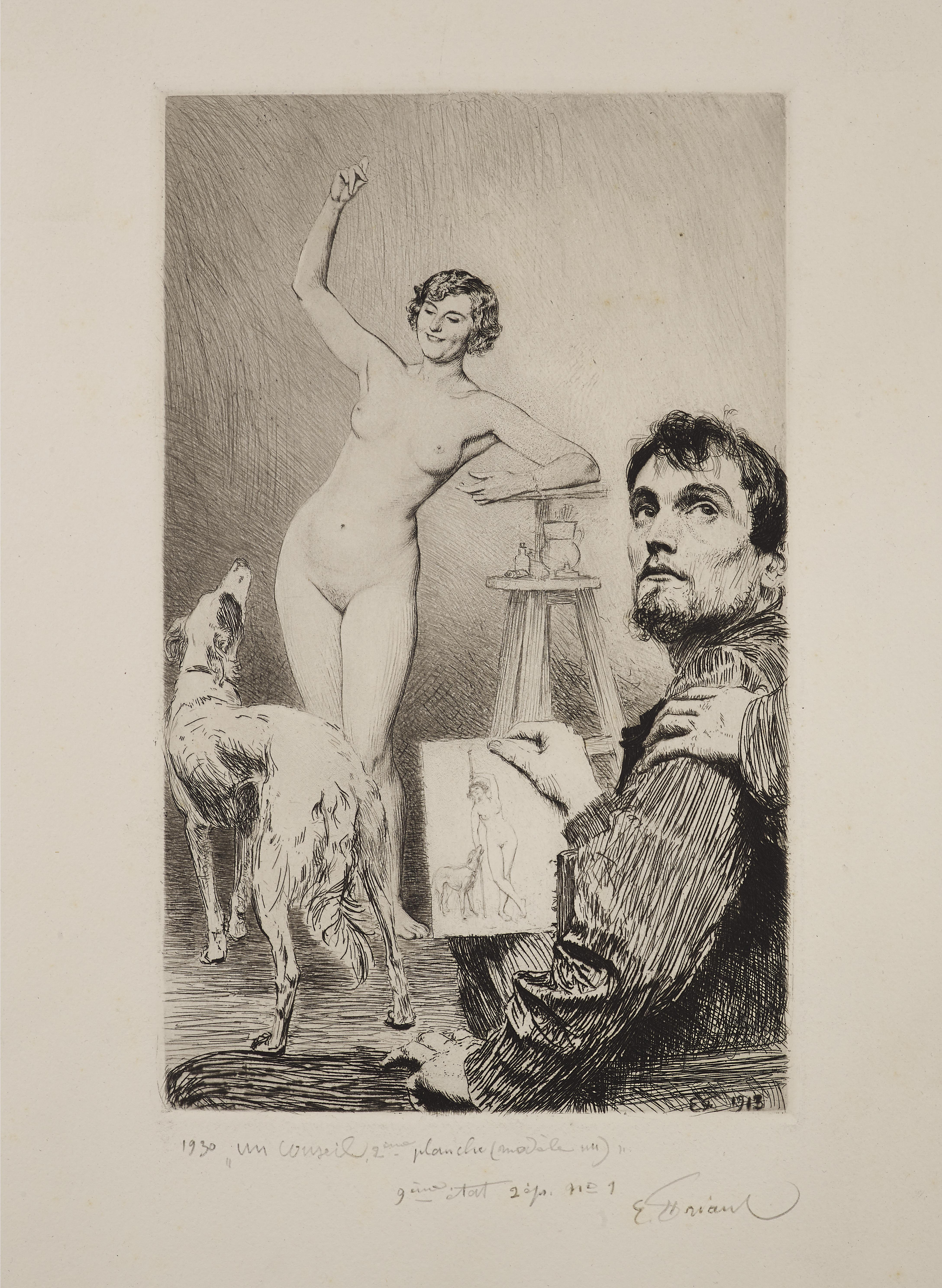 Another close collaboration is revealed by two etchings of the same scene. Anders Zorn, a Swedish artist who lived in Paris for several years, captured his friend Albert Besnard in the act of drawing a female model. The same composition appears in Besnard’s print La Femme au vase. While Zorn’s etching is lively and sketchlike, Besnard’s presents a darker view, steeped in shadowy aquatint.