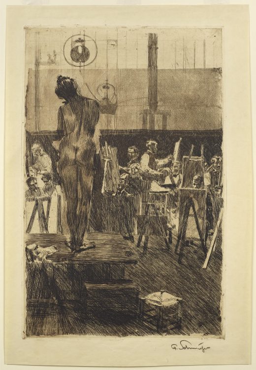 The Katrin Bellinger collection’s holdings offer a wide-ranging overview of the theme of the artist’s model, with examples spanning from the 18th century, with Giambattista Tiepolo’s Academy of the nude, to the present. While many works focus on the didactic aspect of the life class, others place the spotlight on the model as an individual, perhaps showing them in a moment of rest. Others still, like Thomas Rowlandson’s and Charles West Cope’s satirical images, poke fun at the obsessive pursuit of ideal beauty and the ever-present fear of immorality.