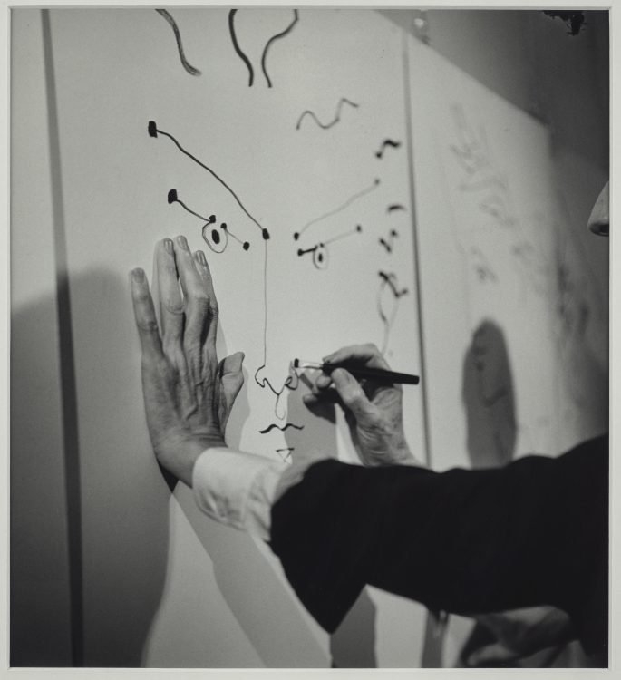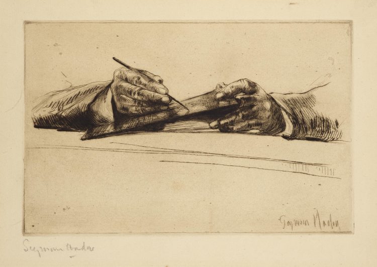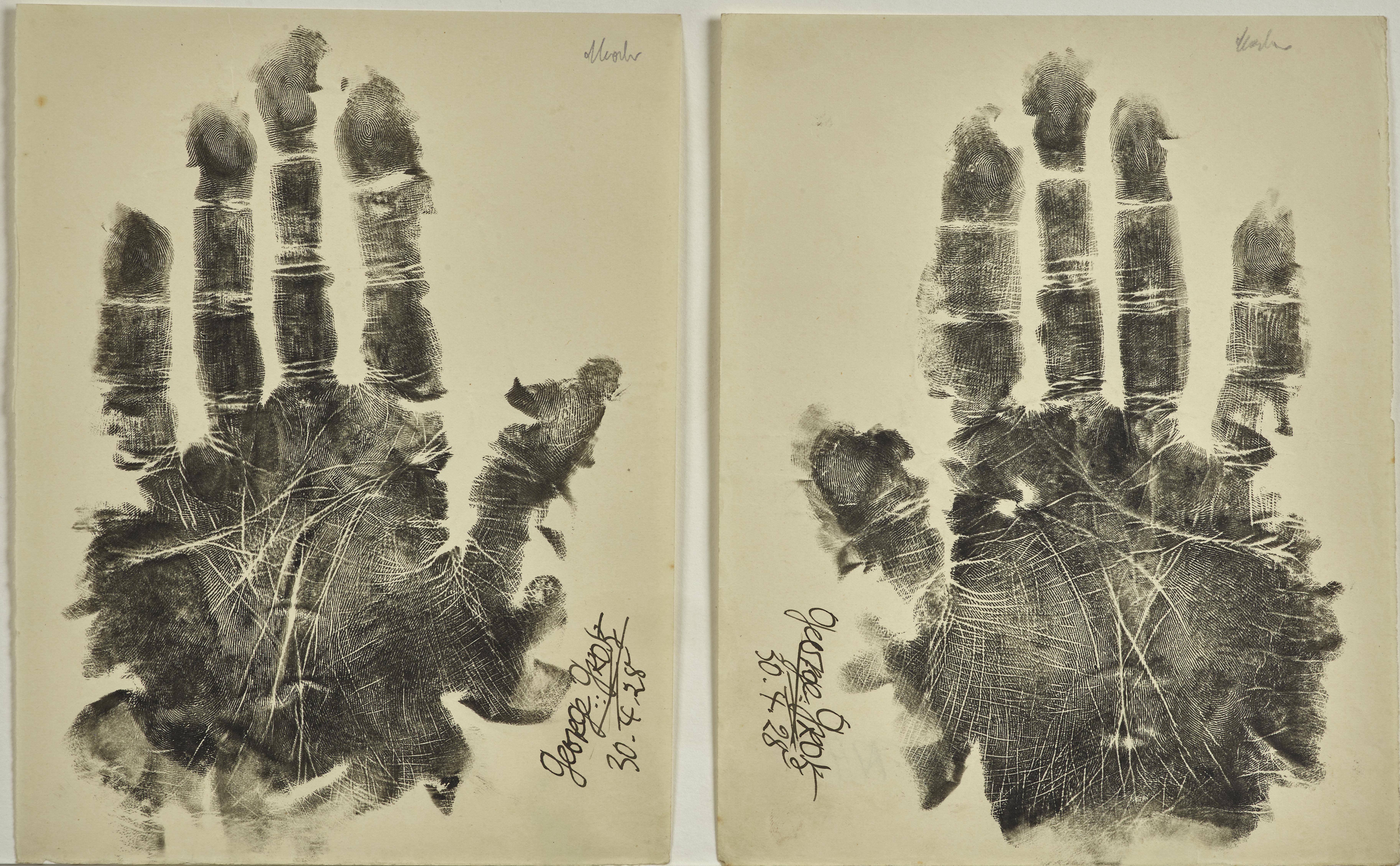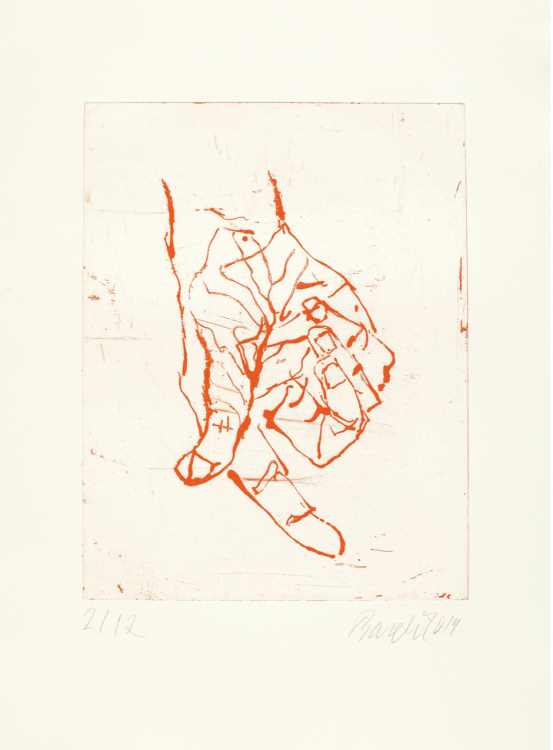 Sir Francis Seymour Haden’s series of prints of his own hands, variously drawing, etching, dry-pointing, or painting are a true catalogue of his skills. Photographer Nicola Bensley said of the resting hand of Frank Auerbach that it was ‘the hand of a master painter…truly.’ Georg Baselitz’s both haunting and powerful prints of his own hand belong to a broader personal investigation of the human form. Finally, the hand-prints collected by Marianne Raschig, signed and dated by each artist, stand as compelling testimonies of direct contact as well as being instruments through which Raschig developed her influential theories on palm-reading.
