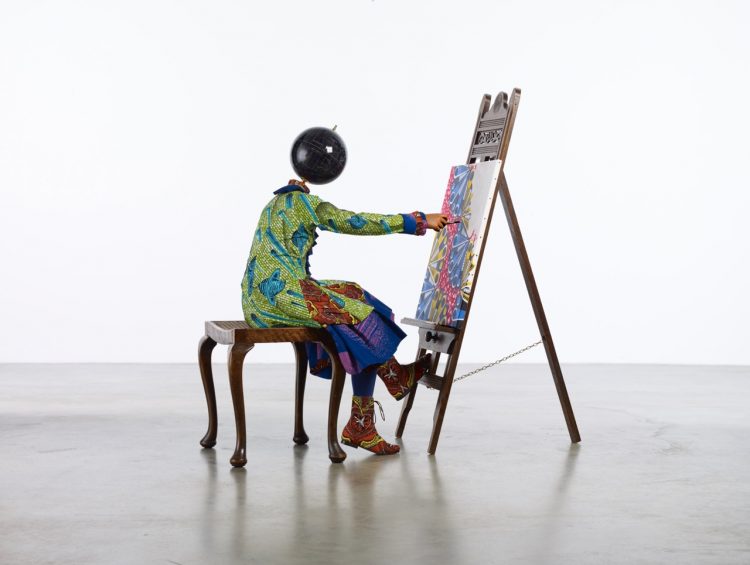 Fibreglass mannequin, Dutch wax printed cotton textile, globe, steel base plate, easel, canvas, and acrylic Katrin Bellinger Collection, inv. no. 2021-002